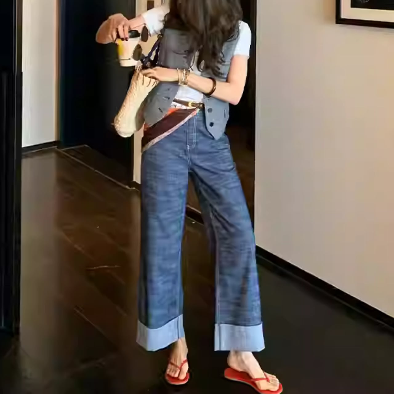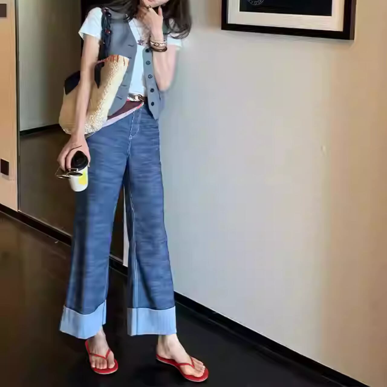 【切替デザインワイドレッグデニムパンツ 】B10007