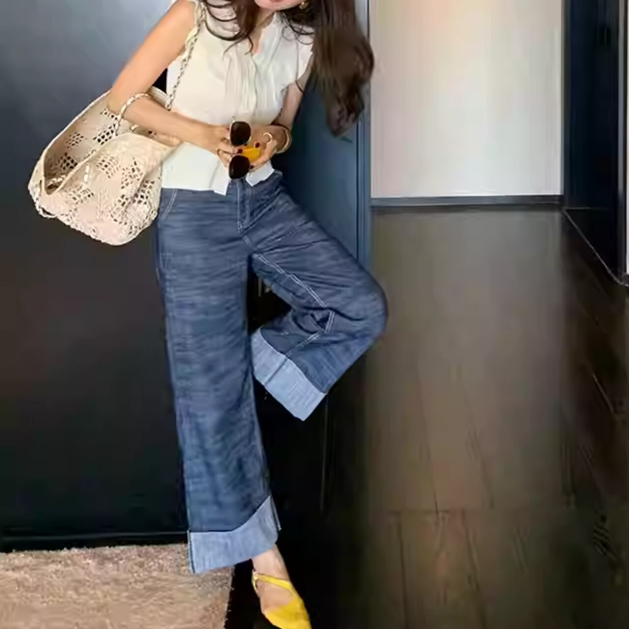 切替デザインが目を引くクロップド丈のワイドレッグデニムパンツです。