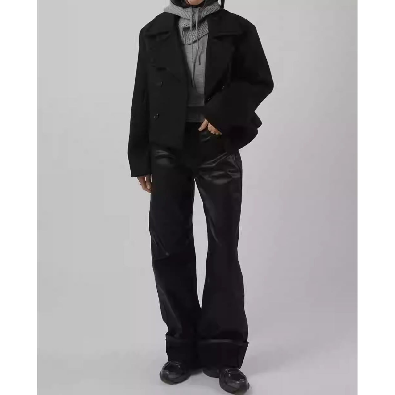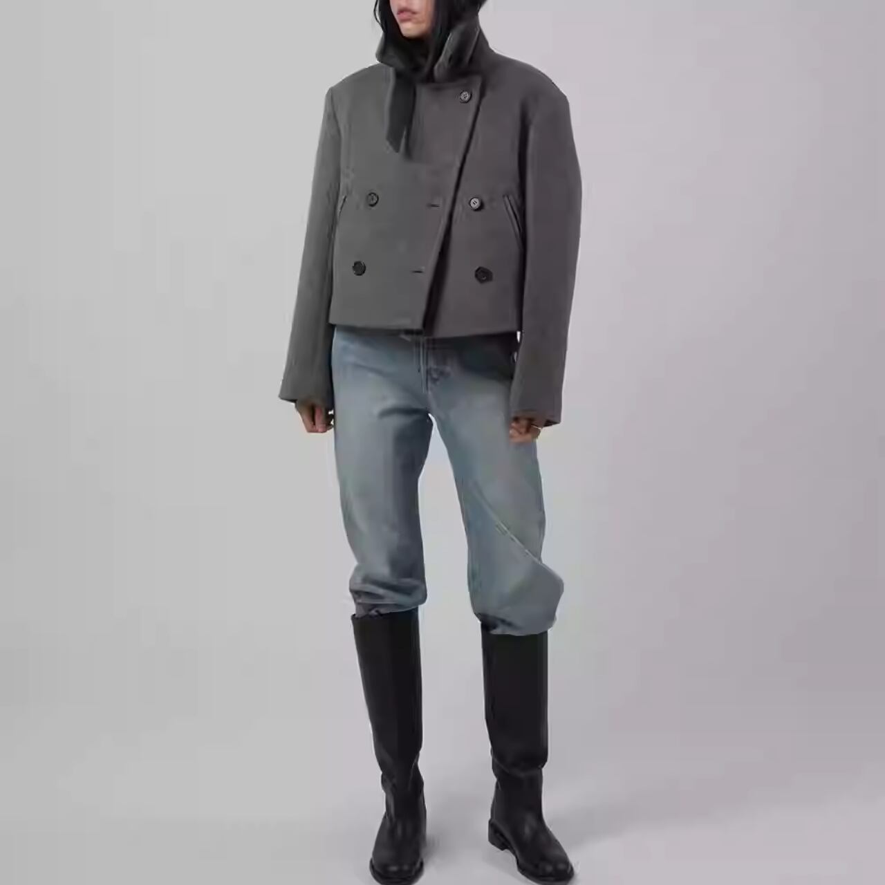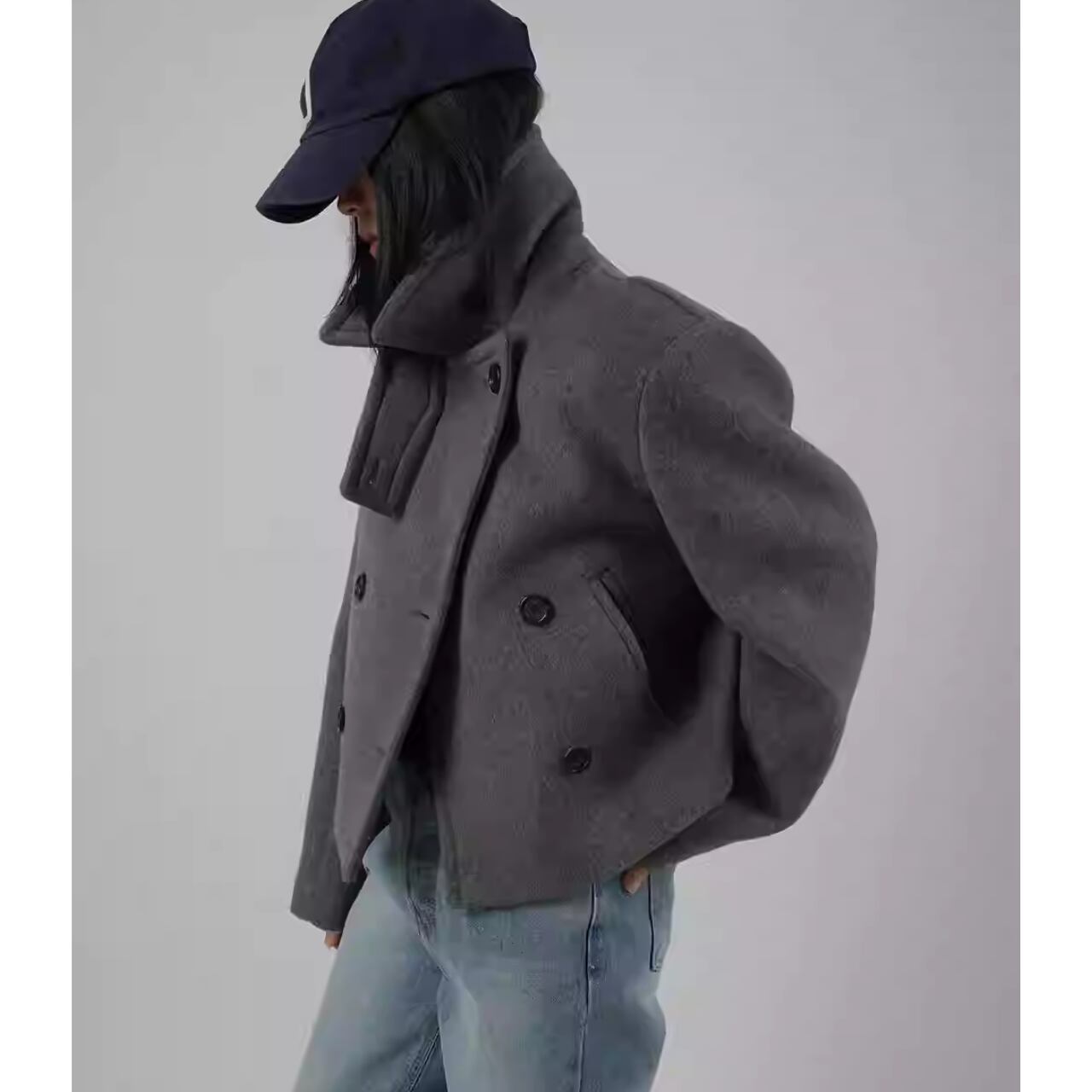 ダブルブレストのデザインが特徴的なヒップ丈ジャケットです。