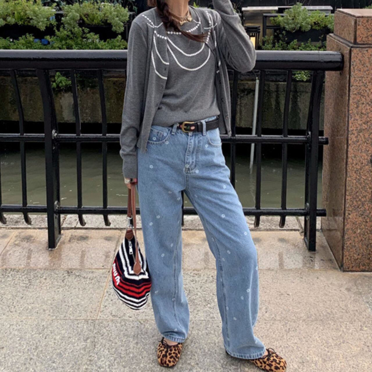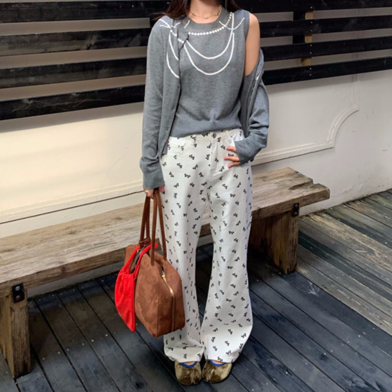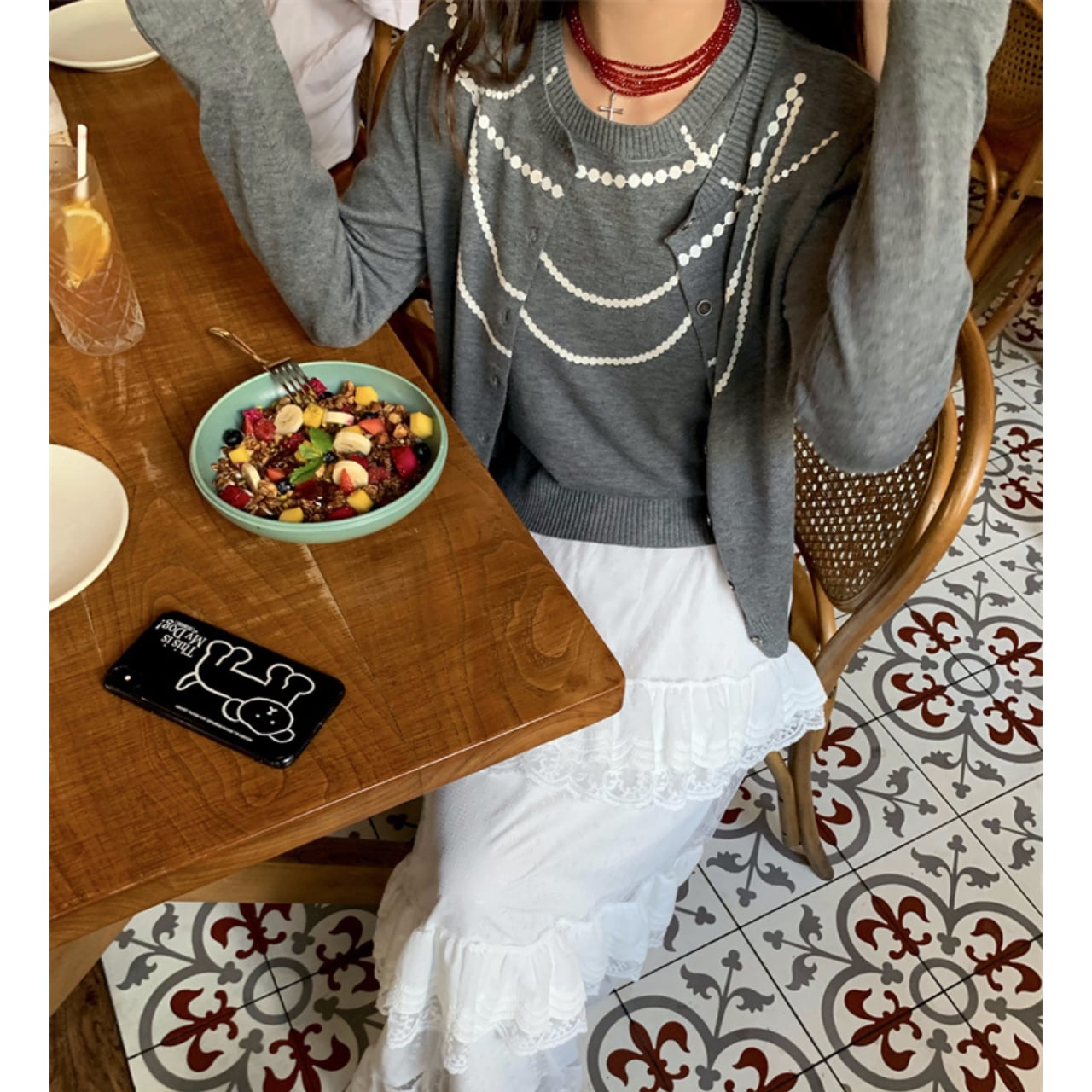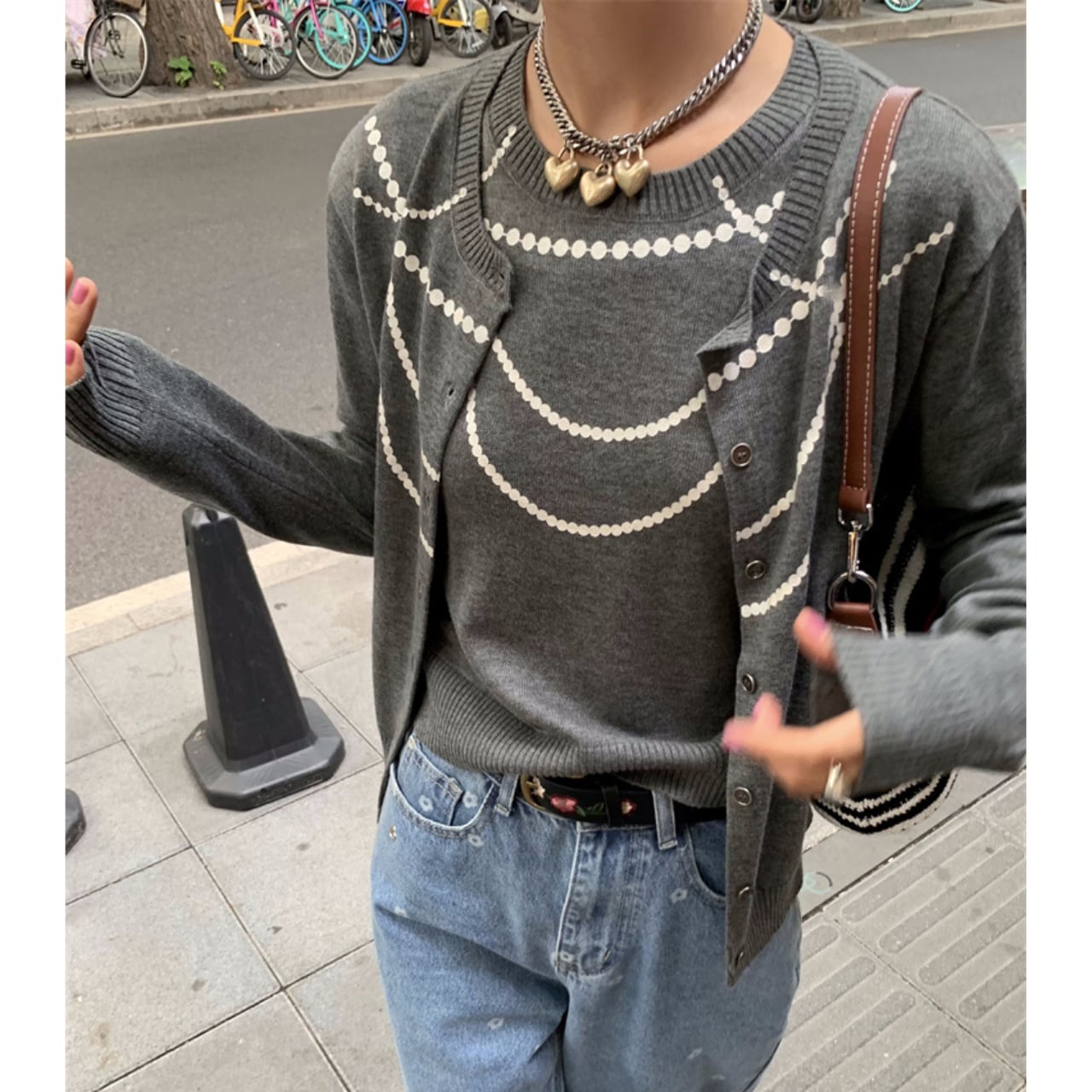 クルーネックが特徴的な長袖カーディガンアンサンブル。