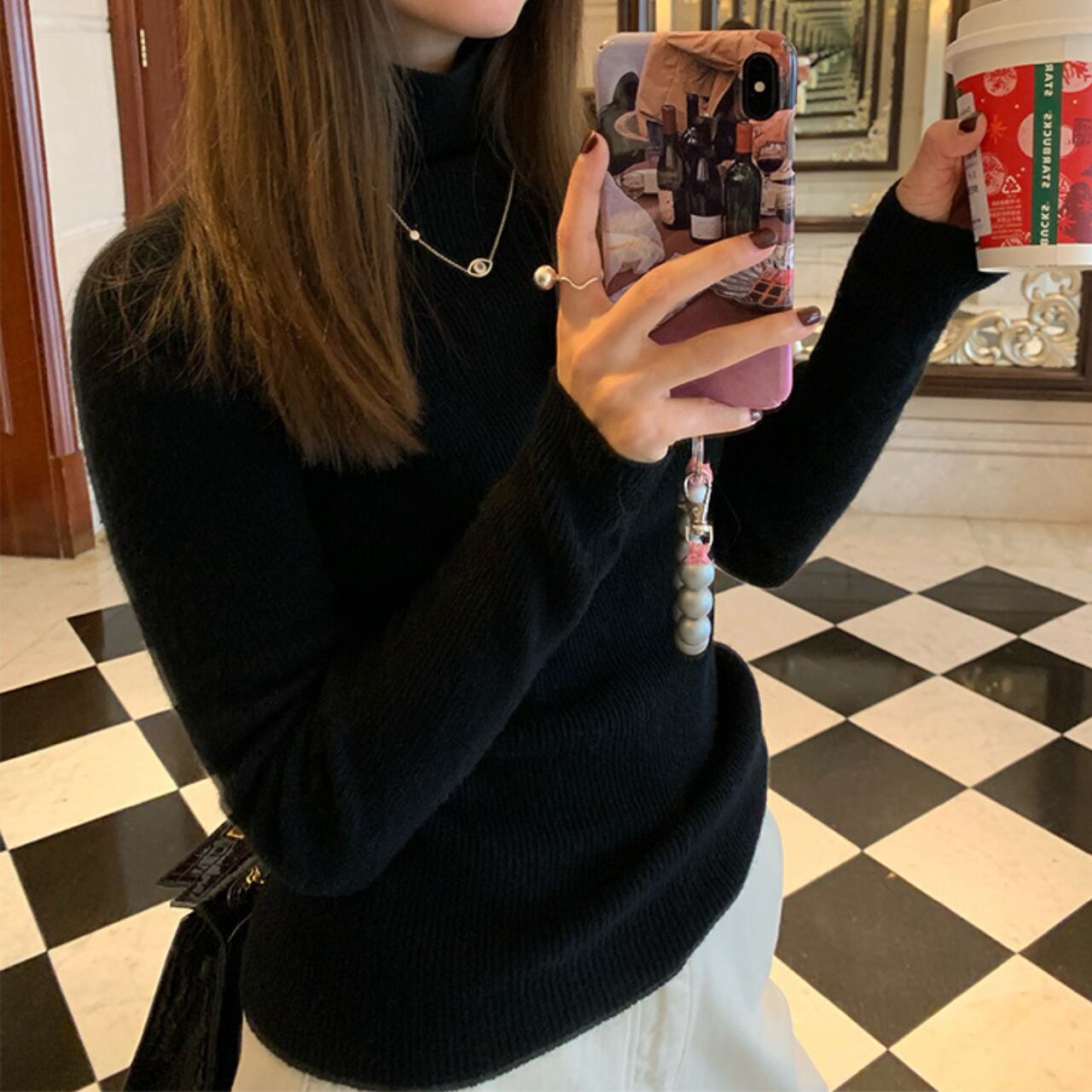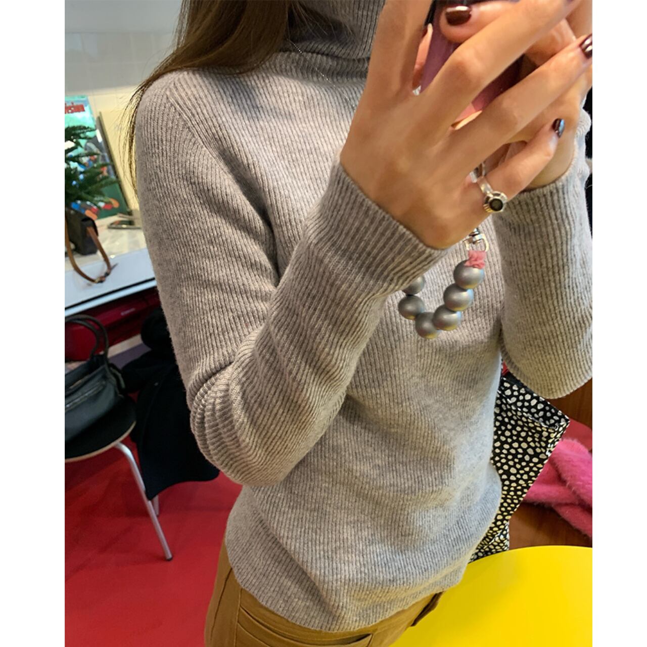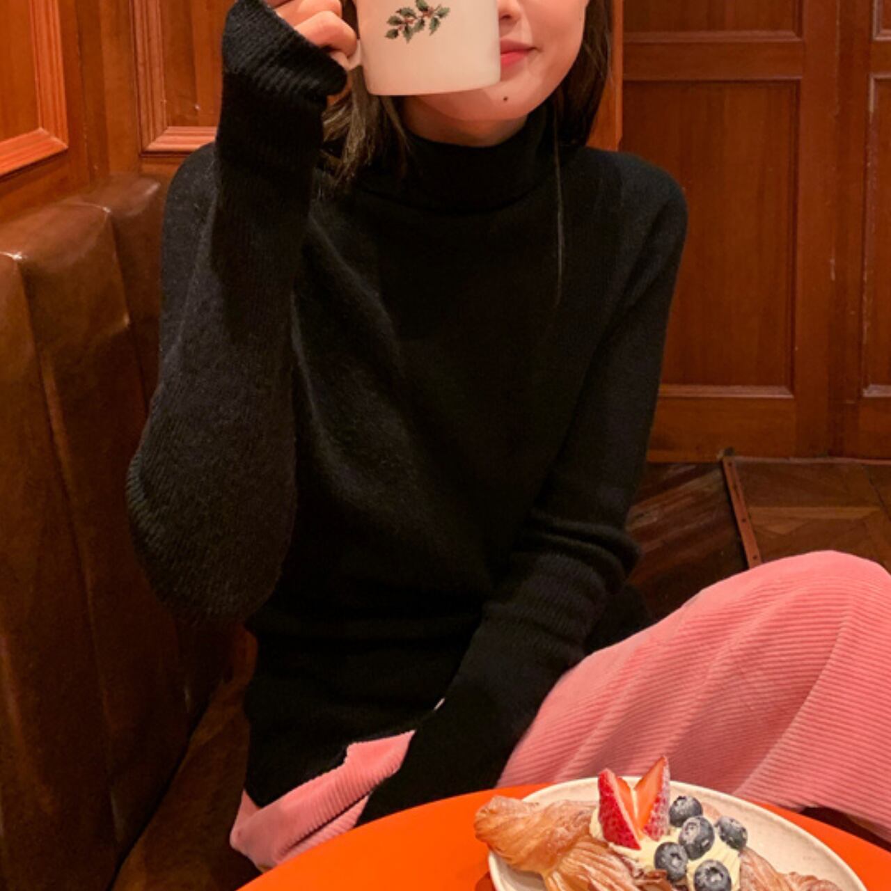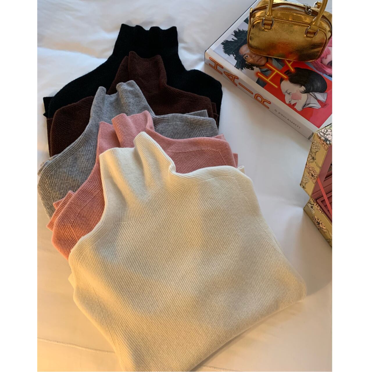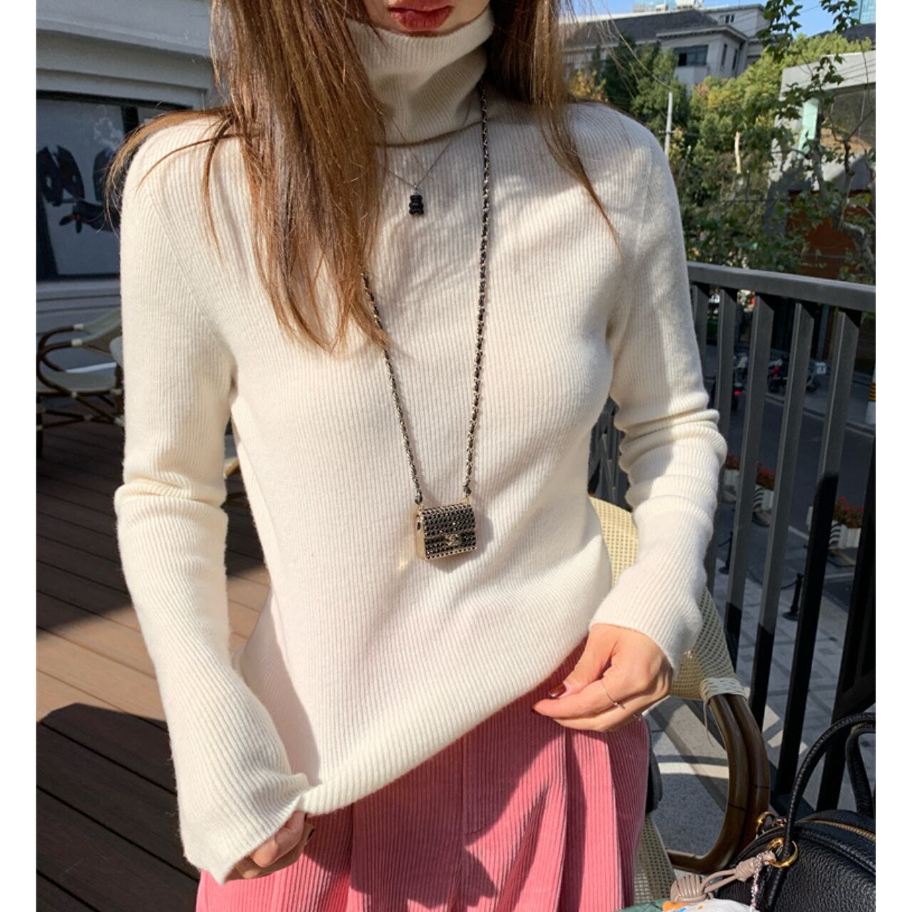 首元を暖かく包み込むタートルネックのニットトップス。