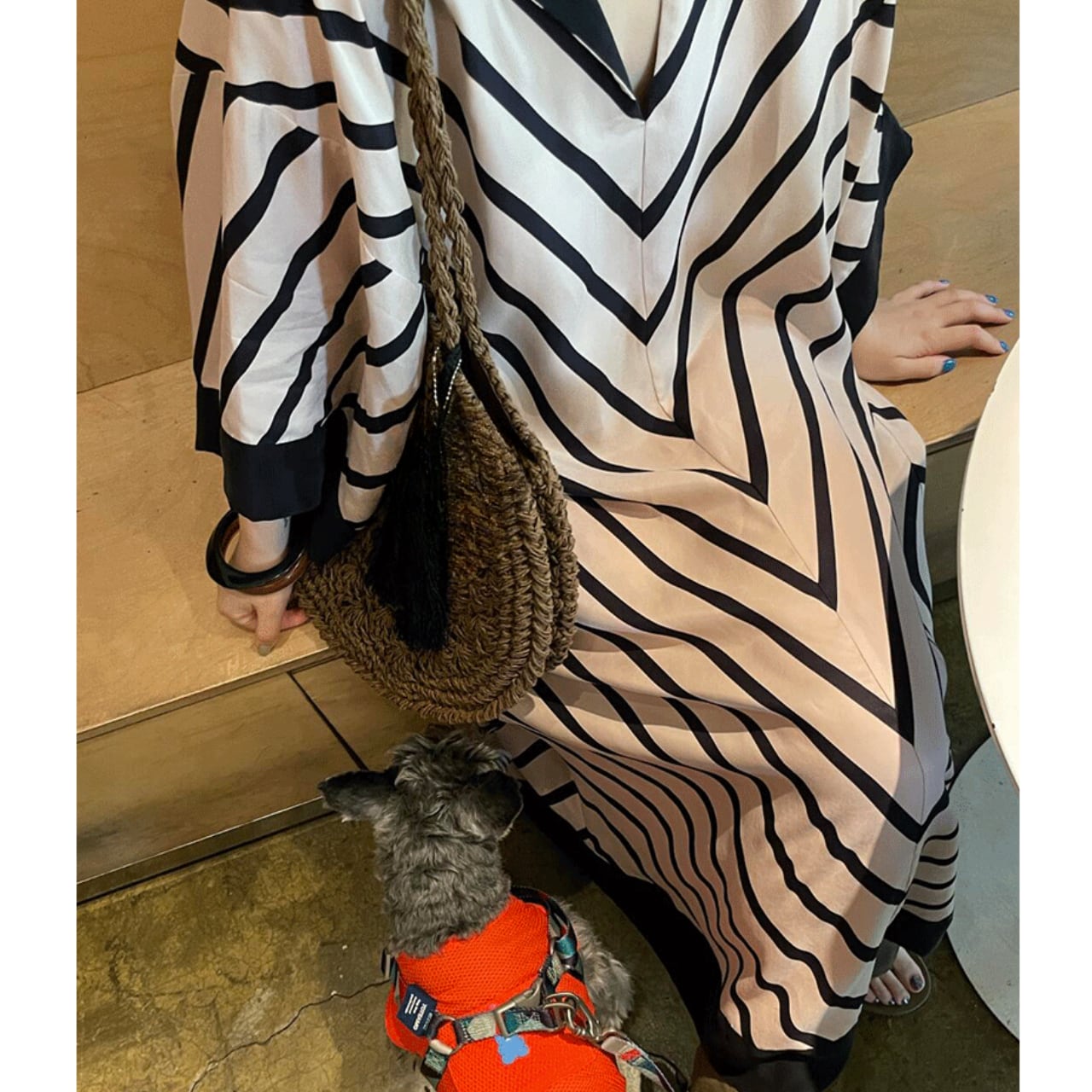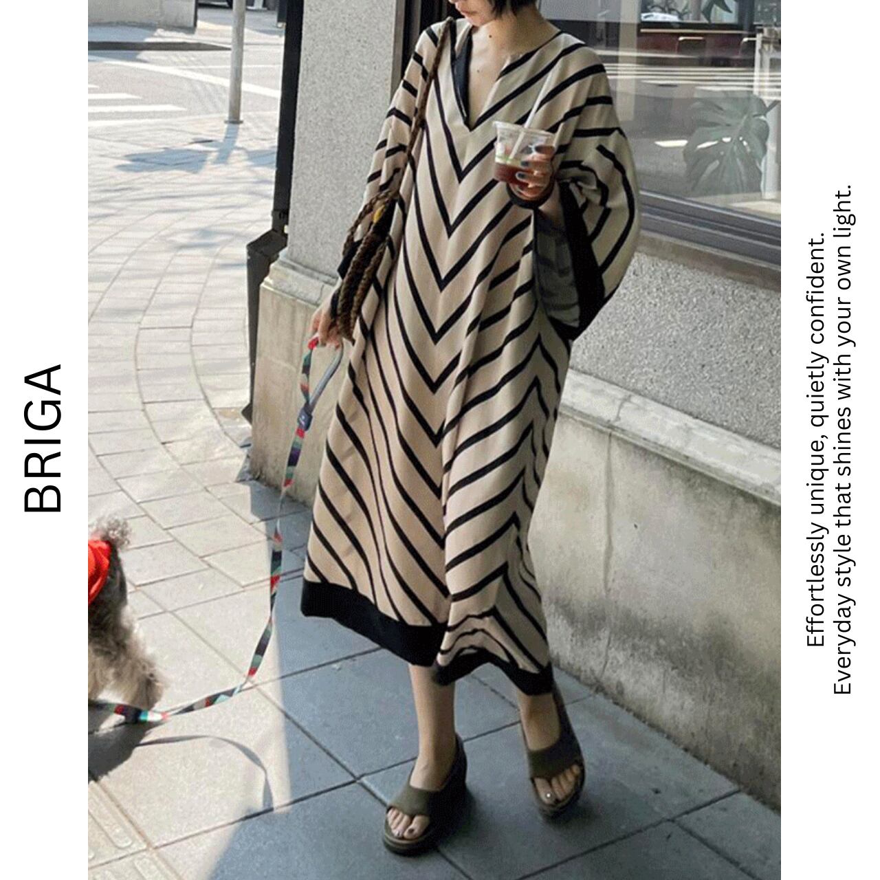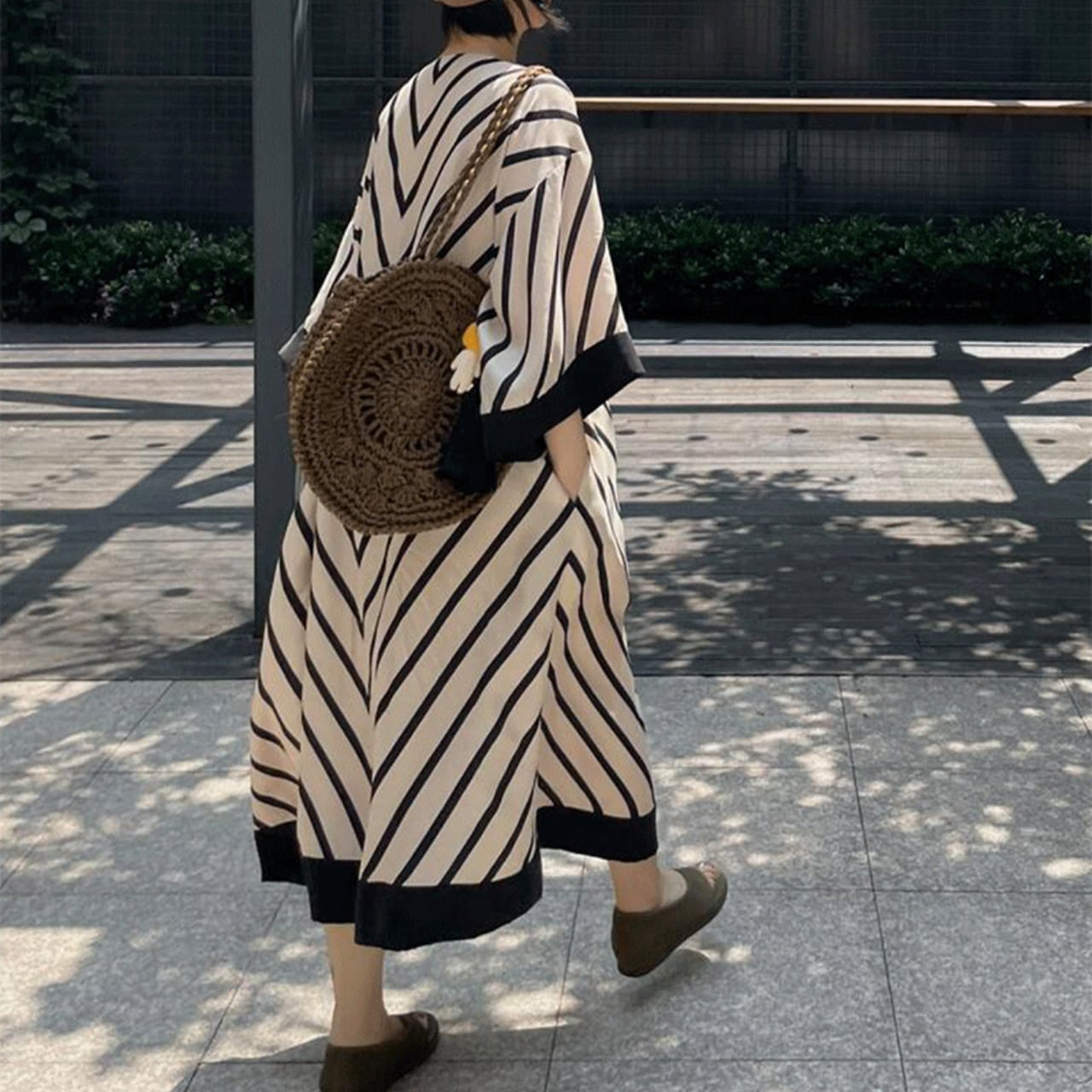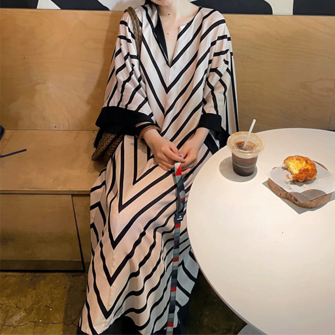 ストライプ柄が目を引くVネックワンピース。