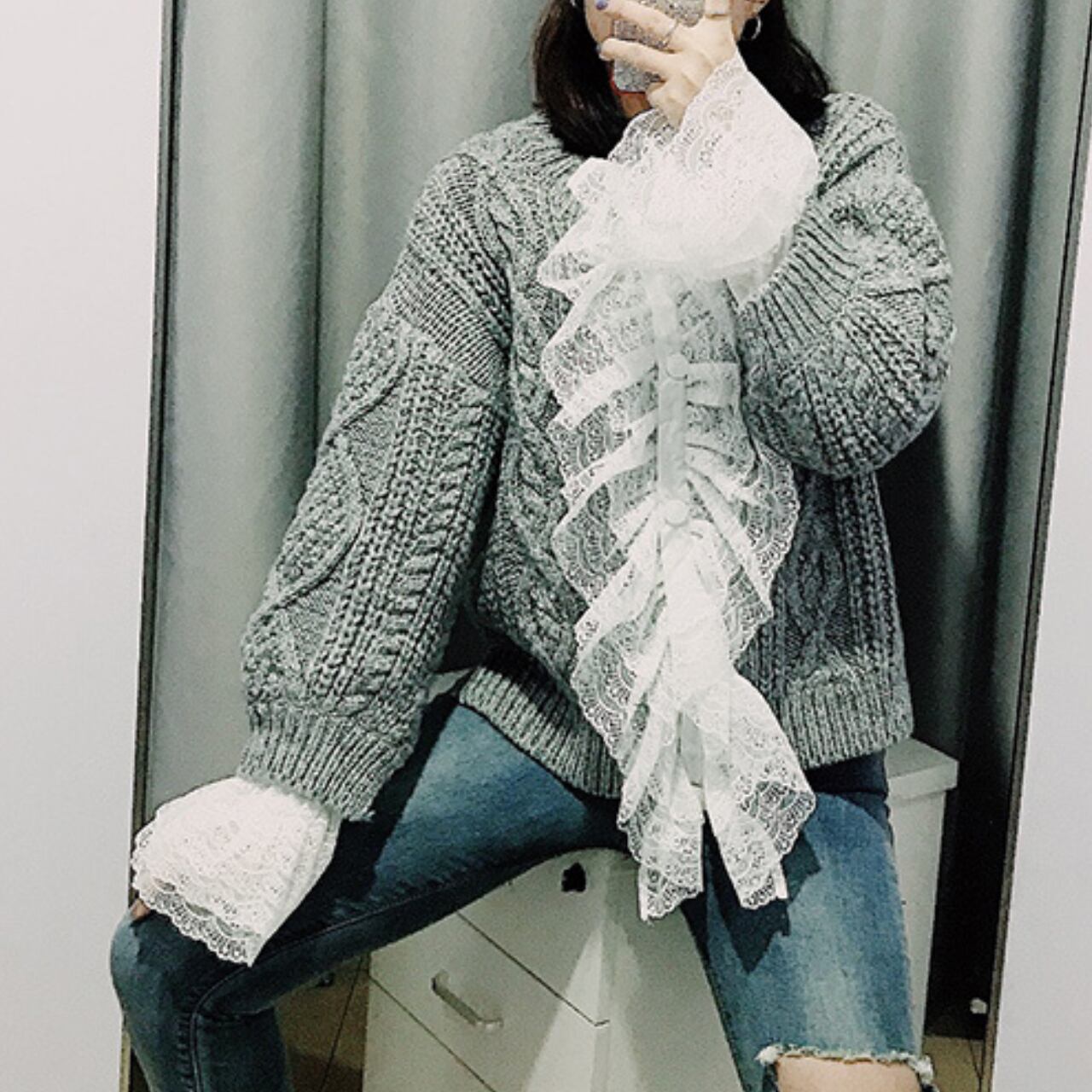 フリルが目を引くニットカーディガン。