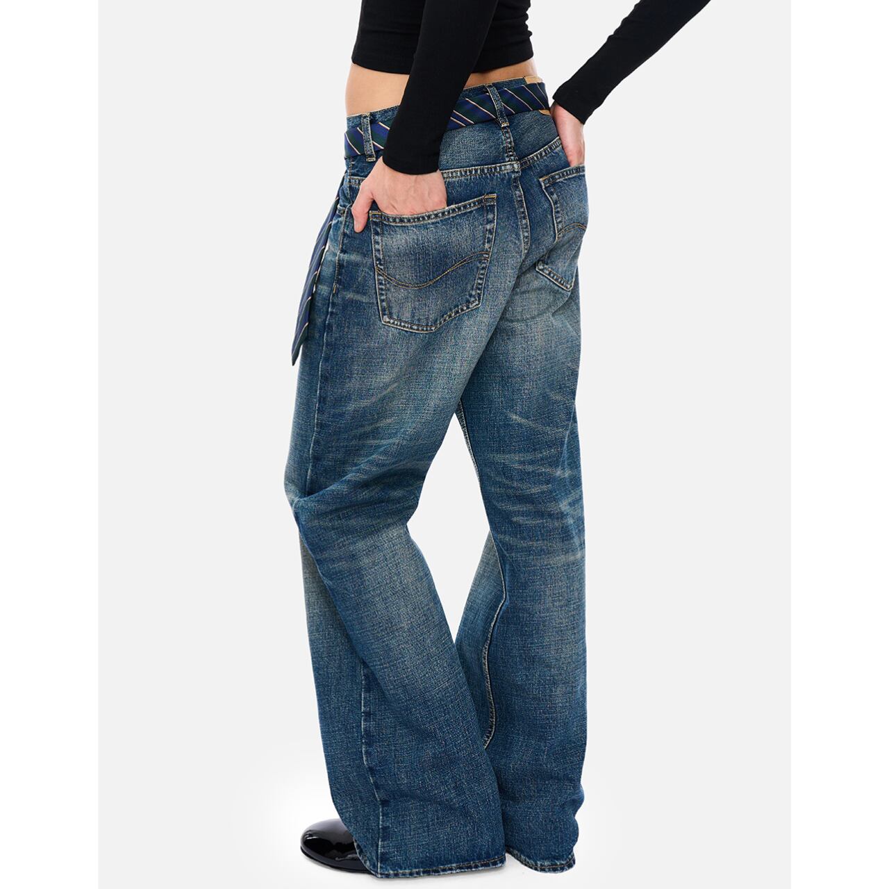 カジュアルながらも洗練された印象を与えるワイドデニムパンツ。