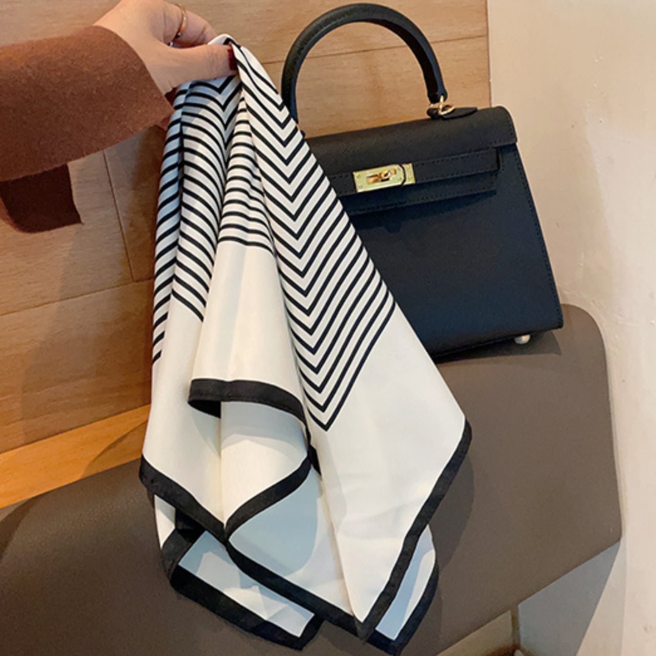 モノトーンのボーダーストライプ柄スカーフは、首元に巻いたり、バッグの持ち手に結んだり、ヘアアレンジに使ったりと、様々な用途で活躍します。