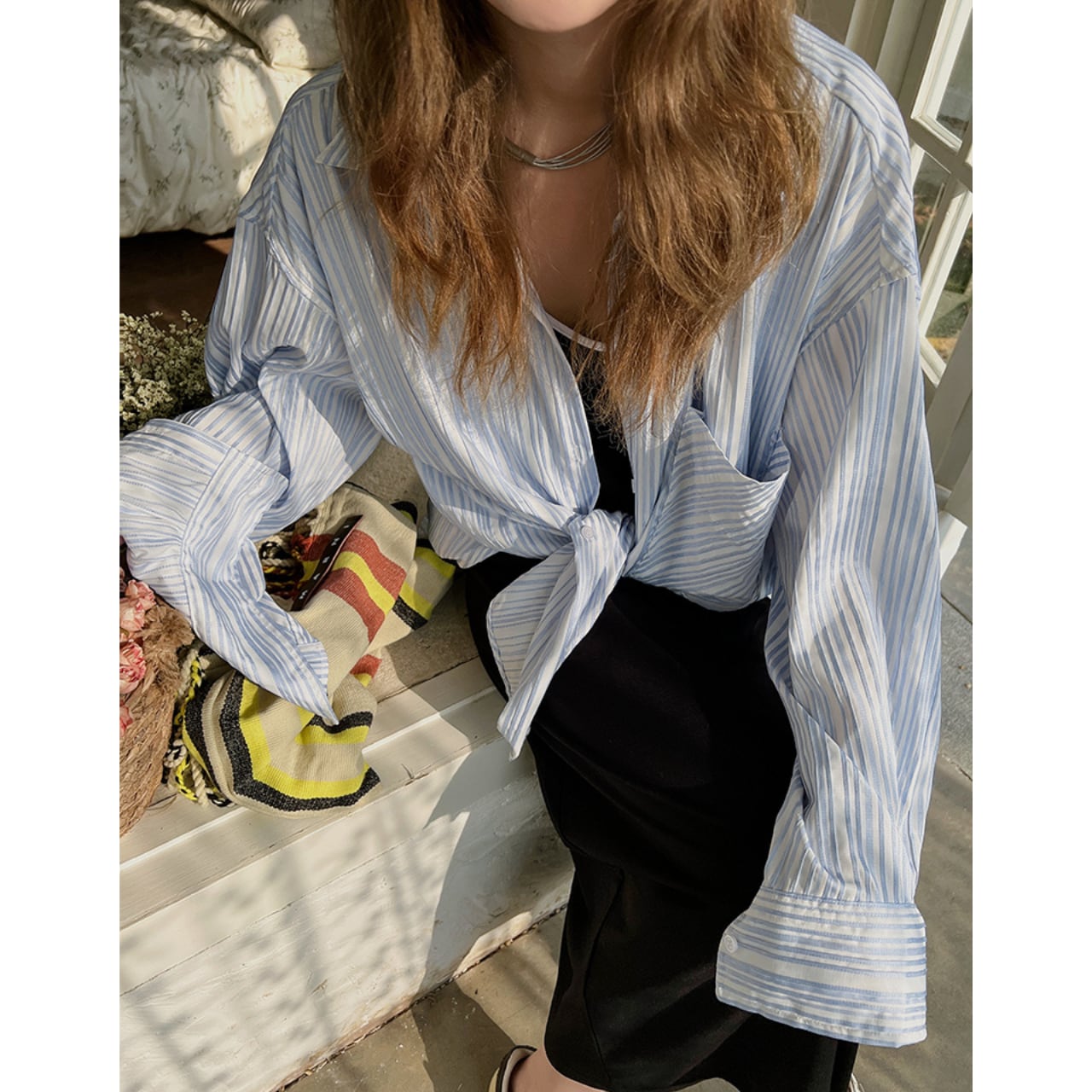 爽やかなストライプ柄が目を引くヒップ丈の長袖シャツです。
