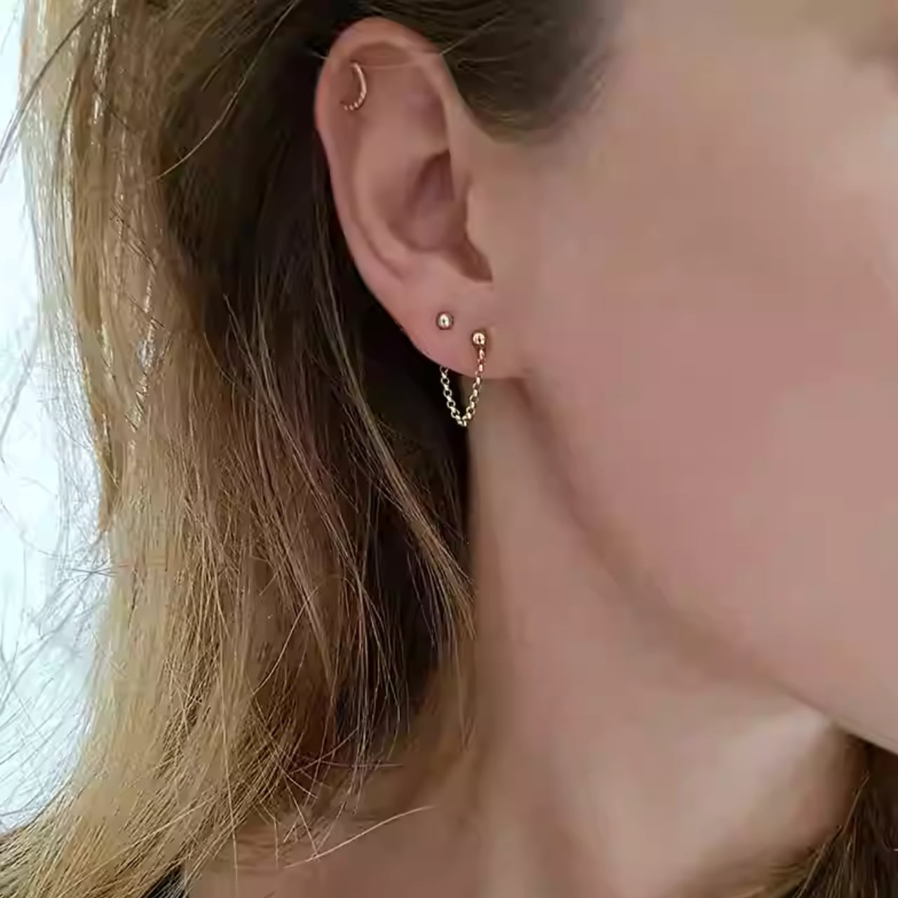 耳元で繊細に揺れるチェーンが、さりげないアクセントをプラス。