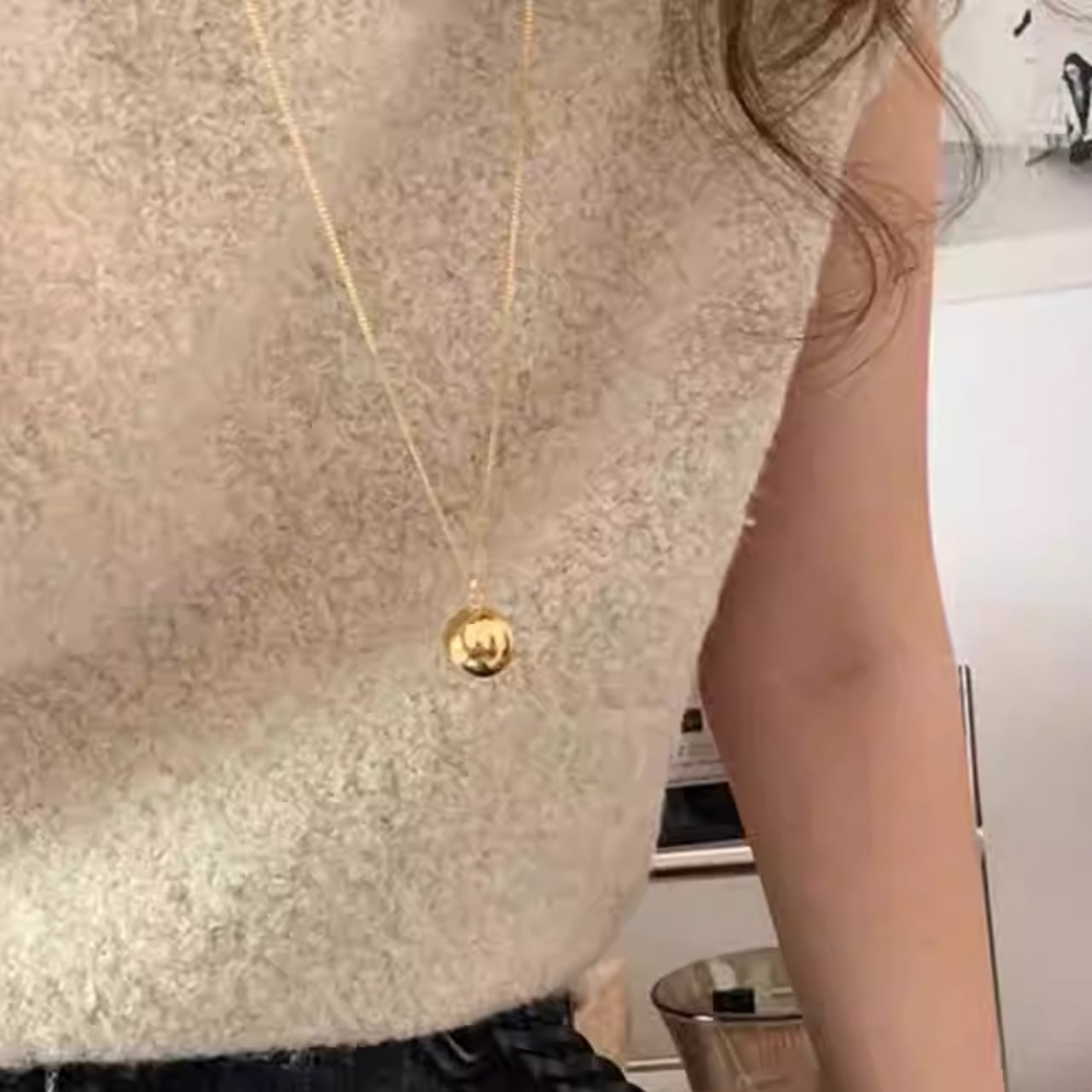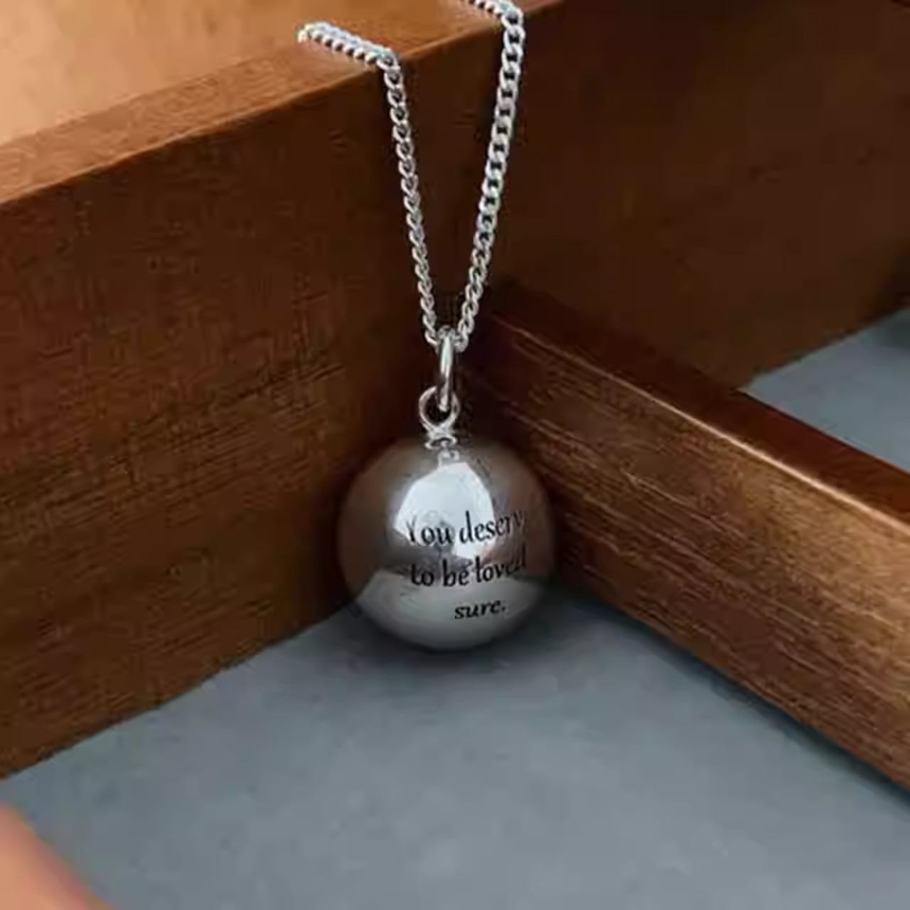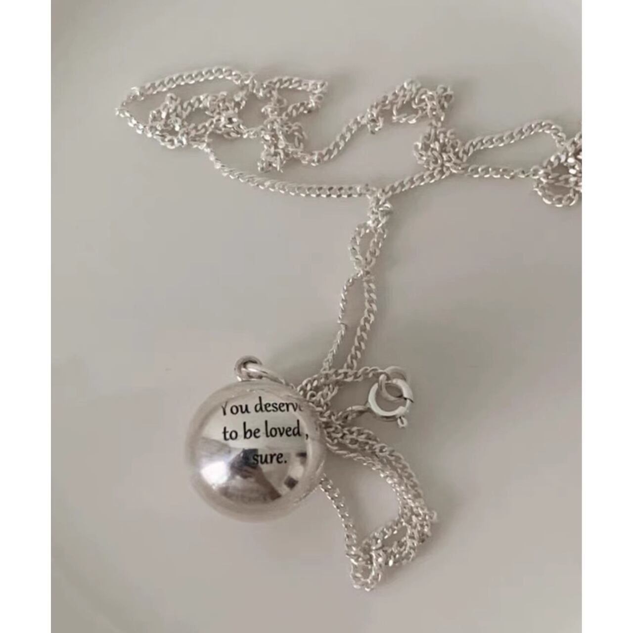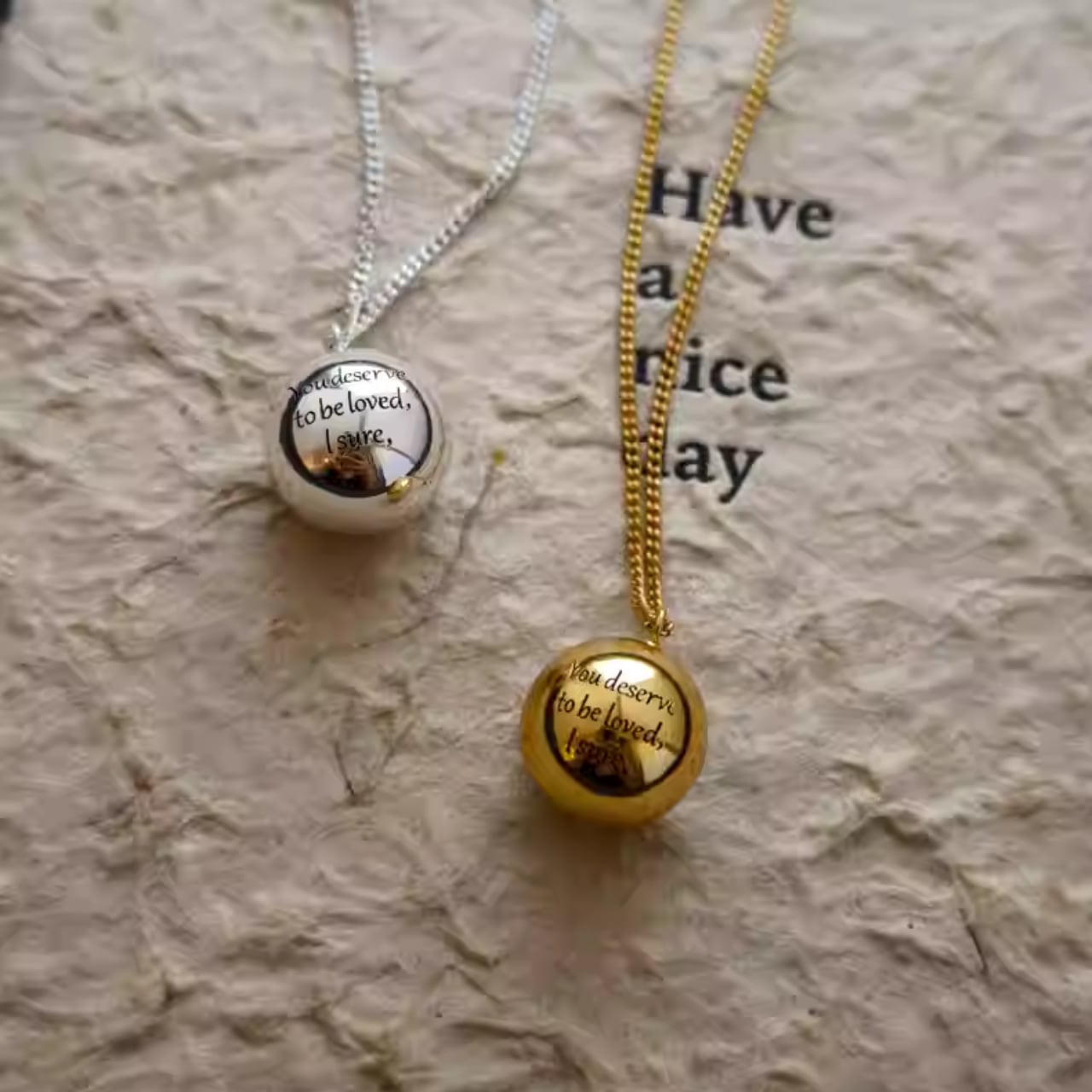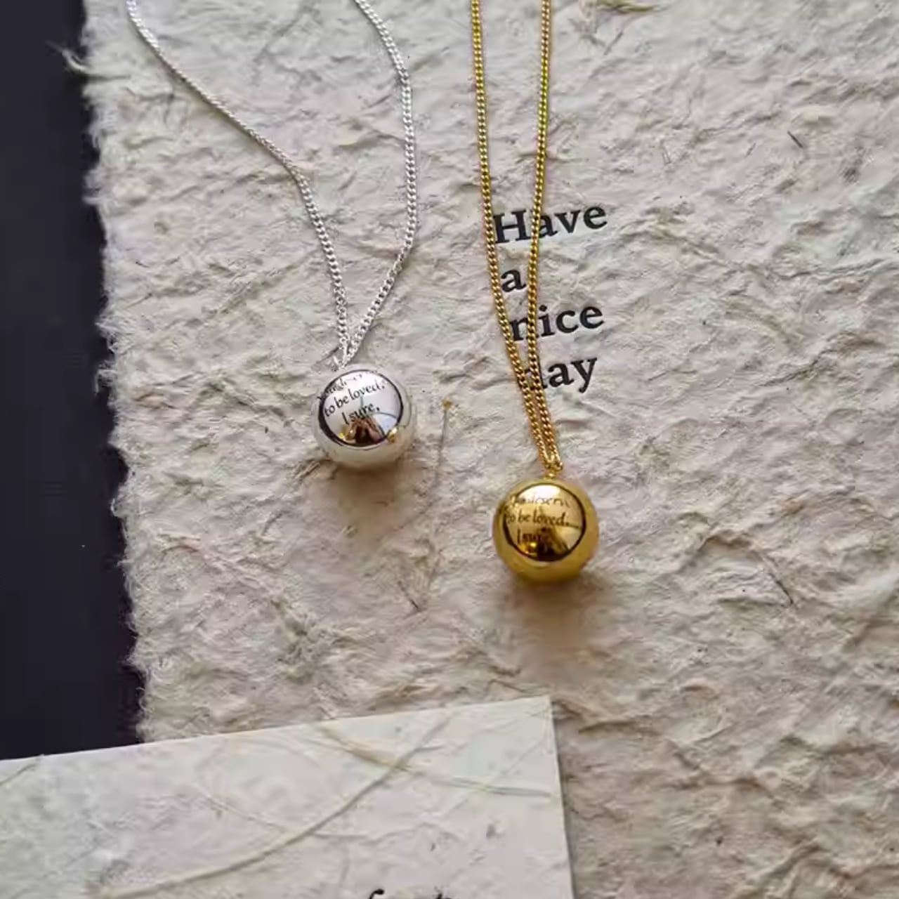 胸元を飾る、メッセージ入りのラウンドペンダントネックレス。
