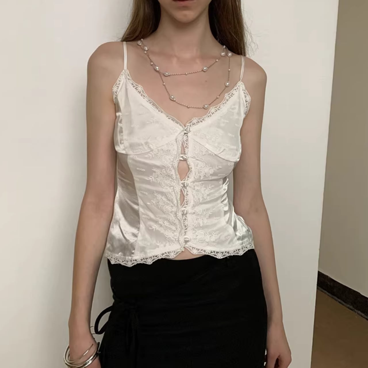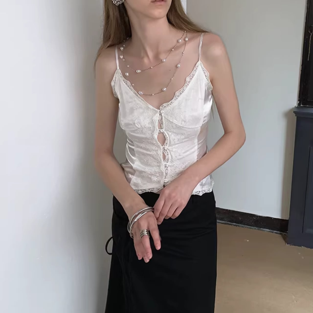 繊細なレースとフロントボタンがポイントのキャミソール。