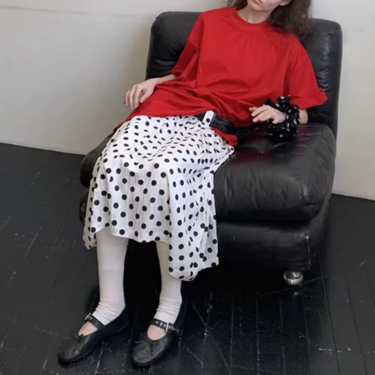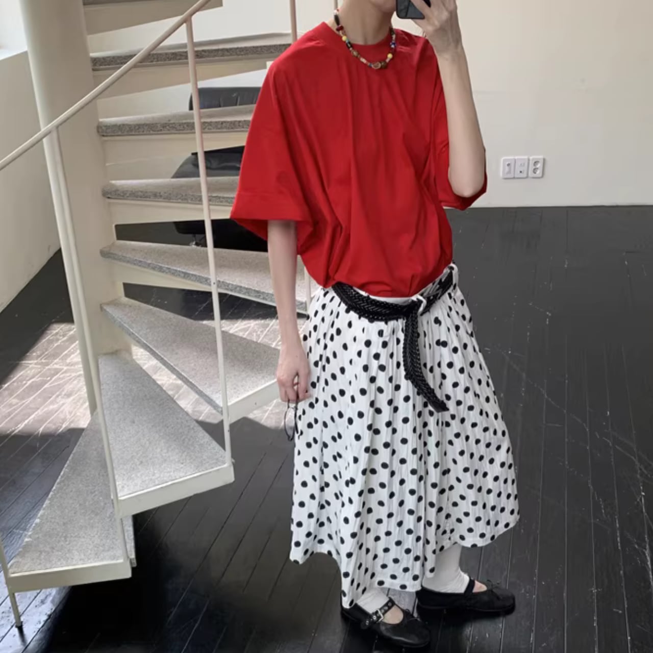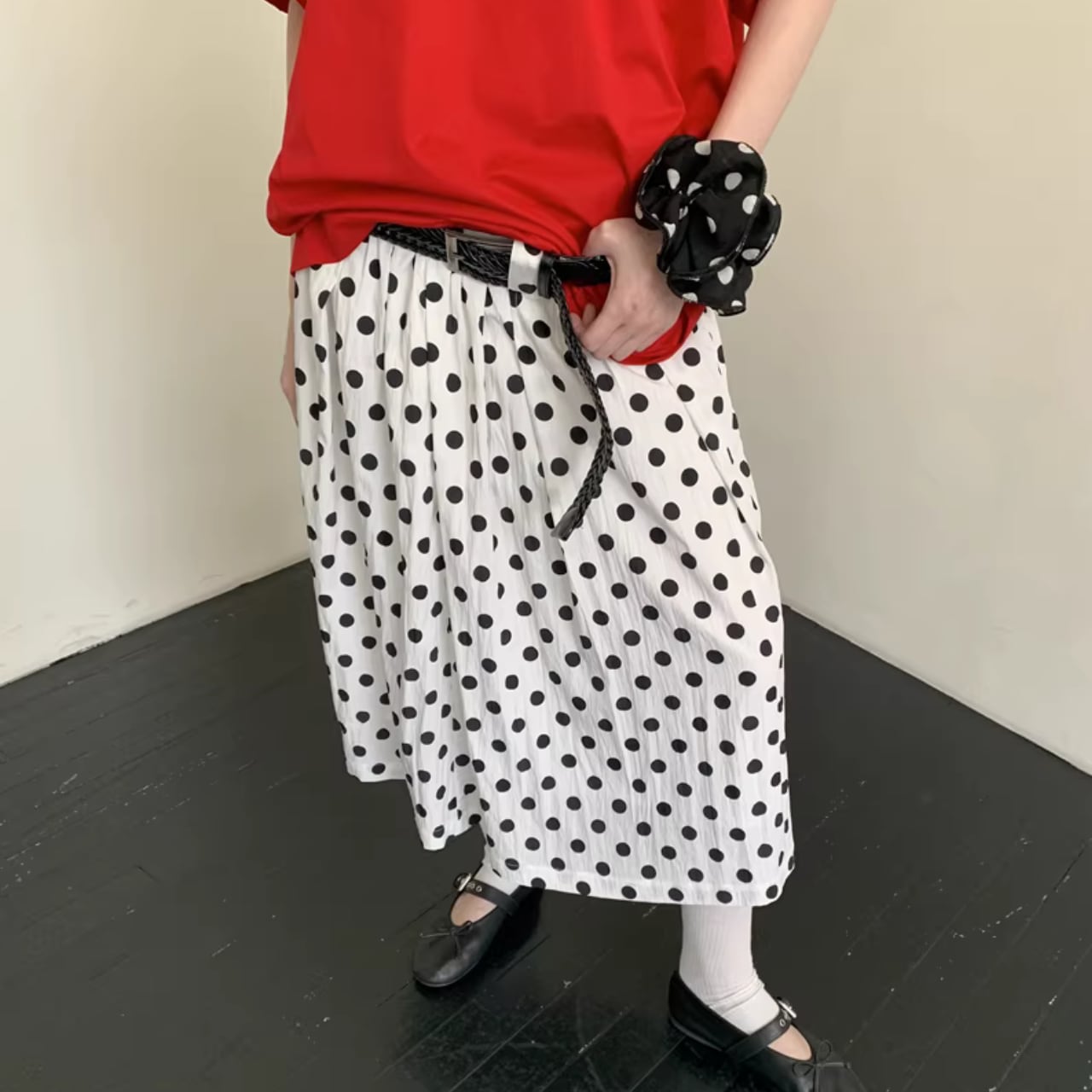【ベルト付きロング丈ドット柄スカート 】B10074