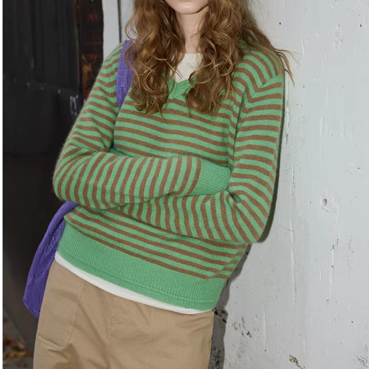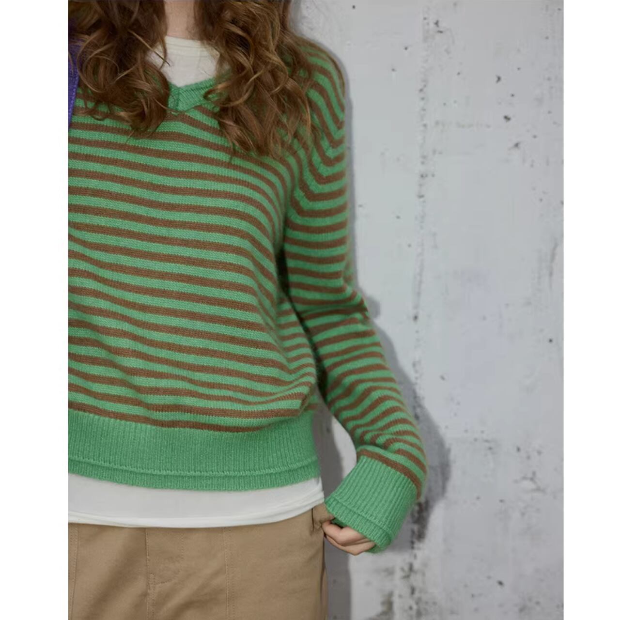 ボーダー柄がアクセントになり、普段のコーディネートに取り入れやすいデザインです。
