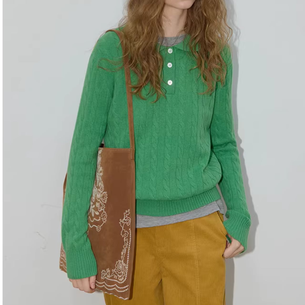 ケーブル編みが上品な印象の長袖ニットポロシャツ。