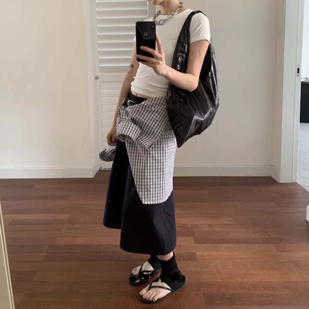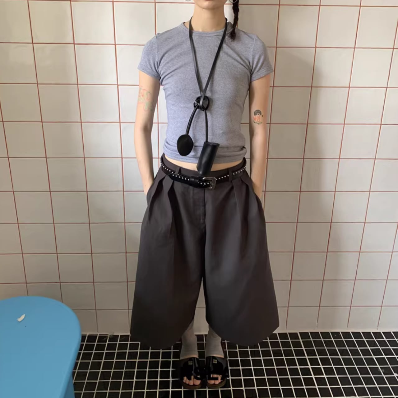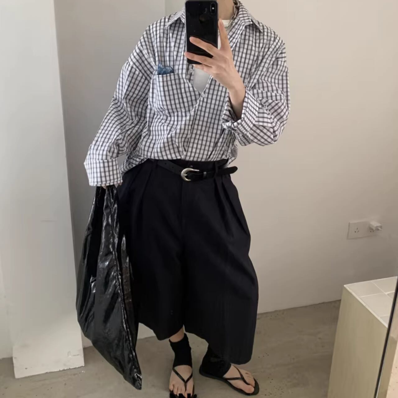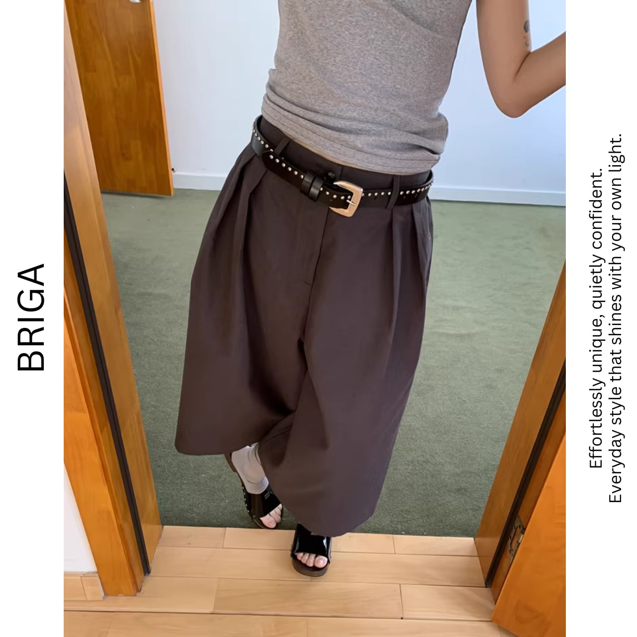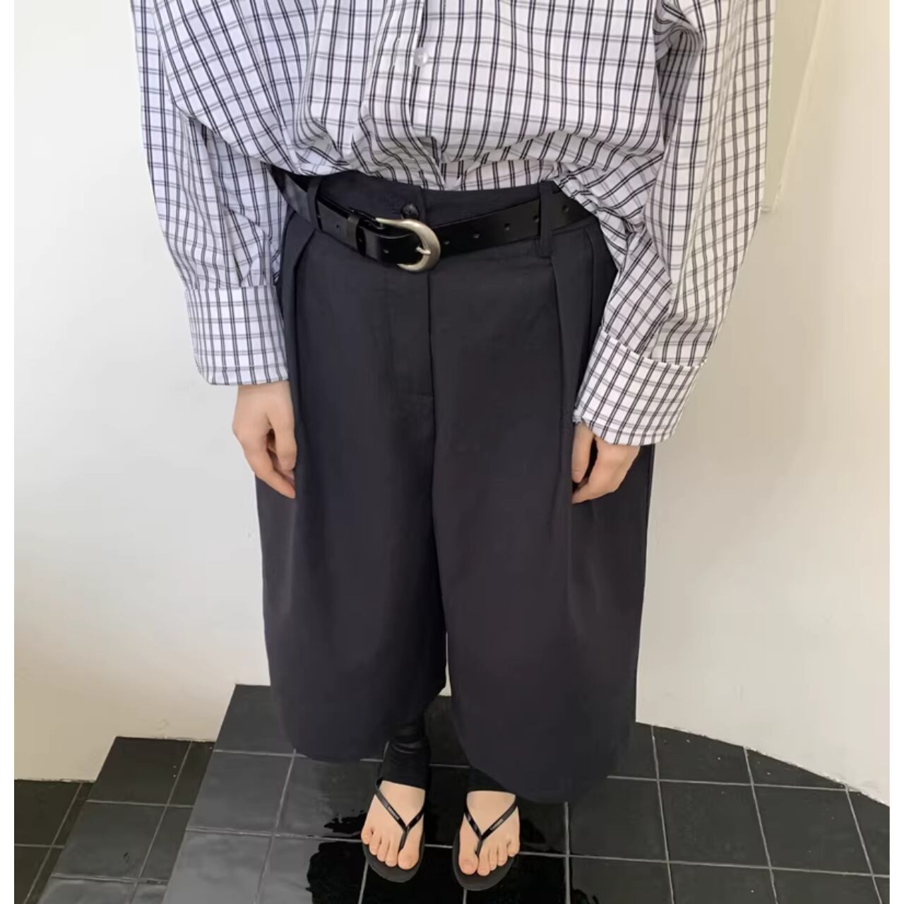 ワイドなシルエットで、気になる体型をカバーしつつ、トレンド感のある着こなしが完成します。