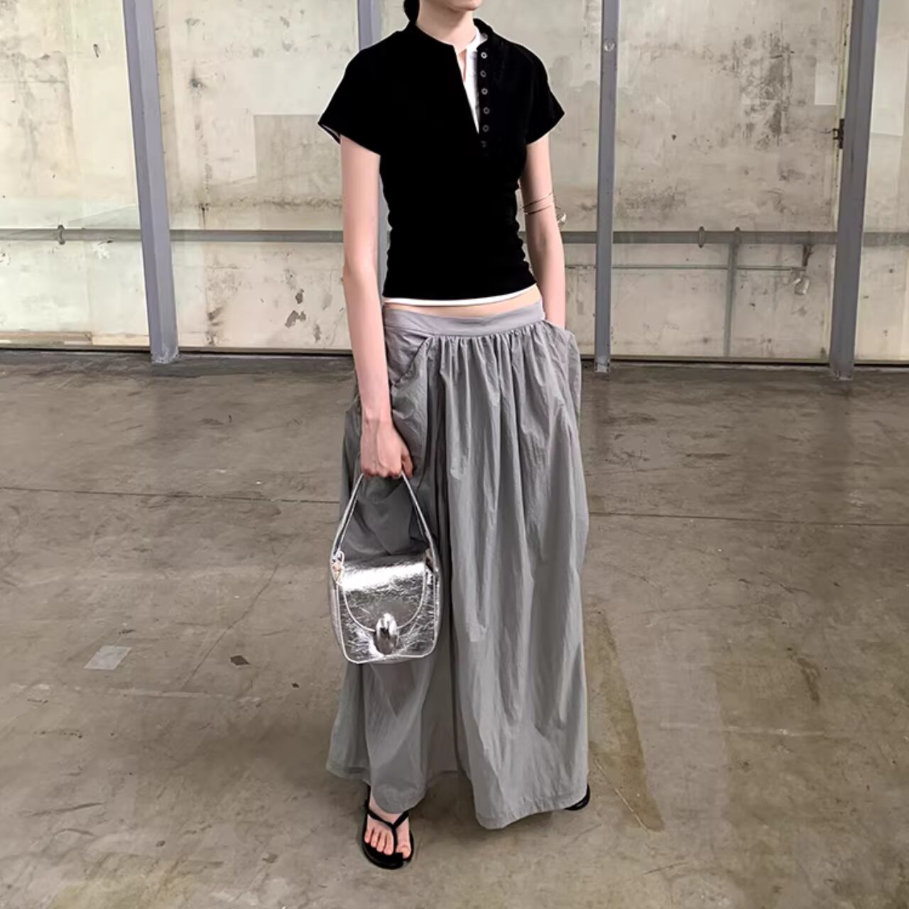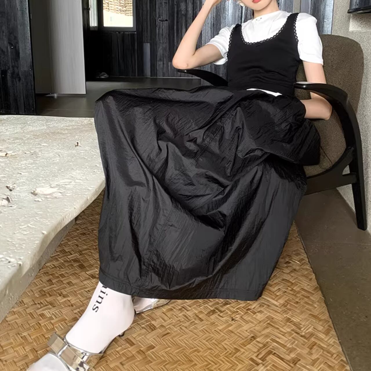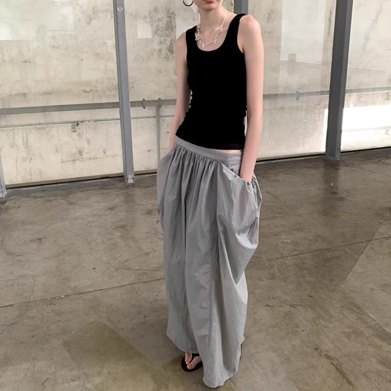 ドローストリングでギャザーを寄せたデザインが特徴的なスカート。