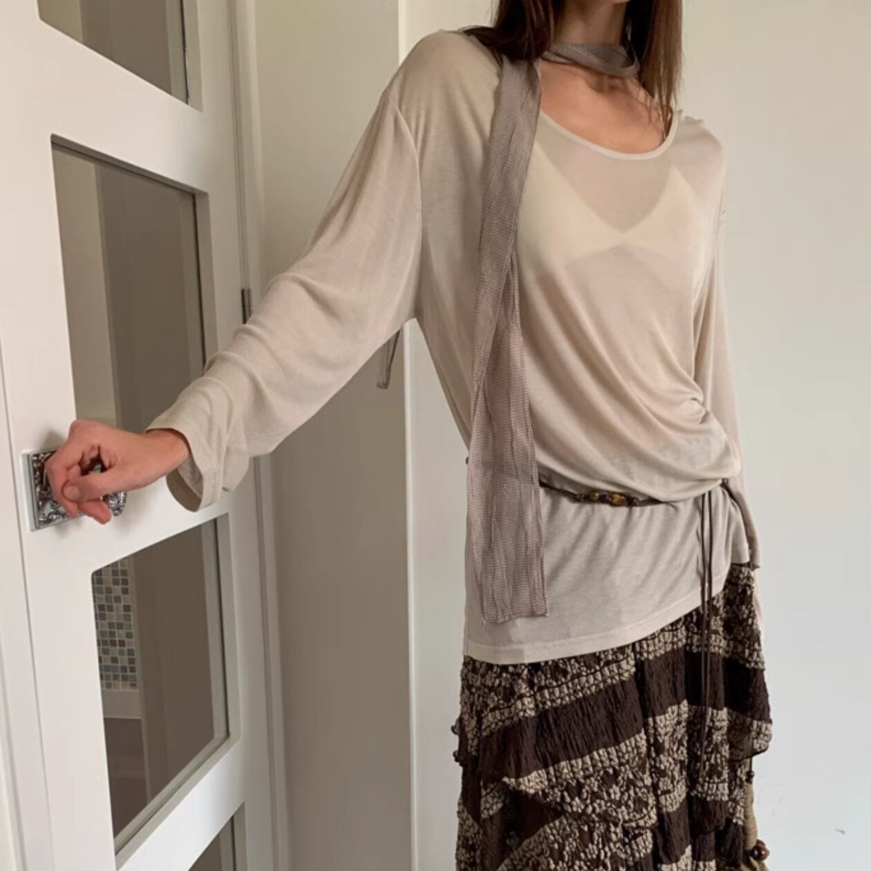 【スカーフ付きロング丈ラウンドネックプルオーバー】B00097