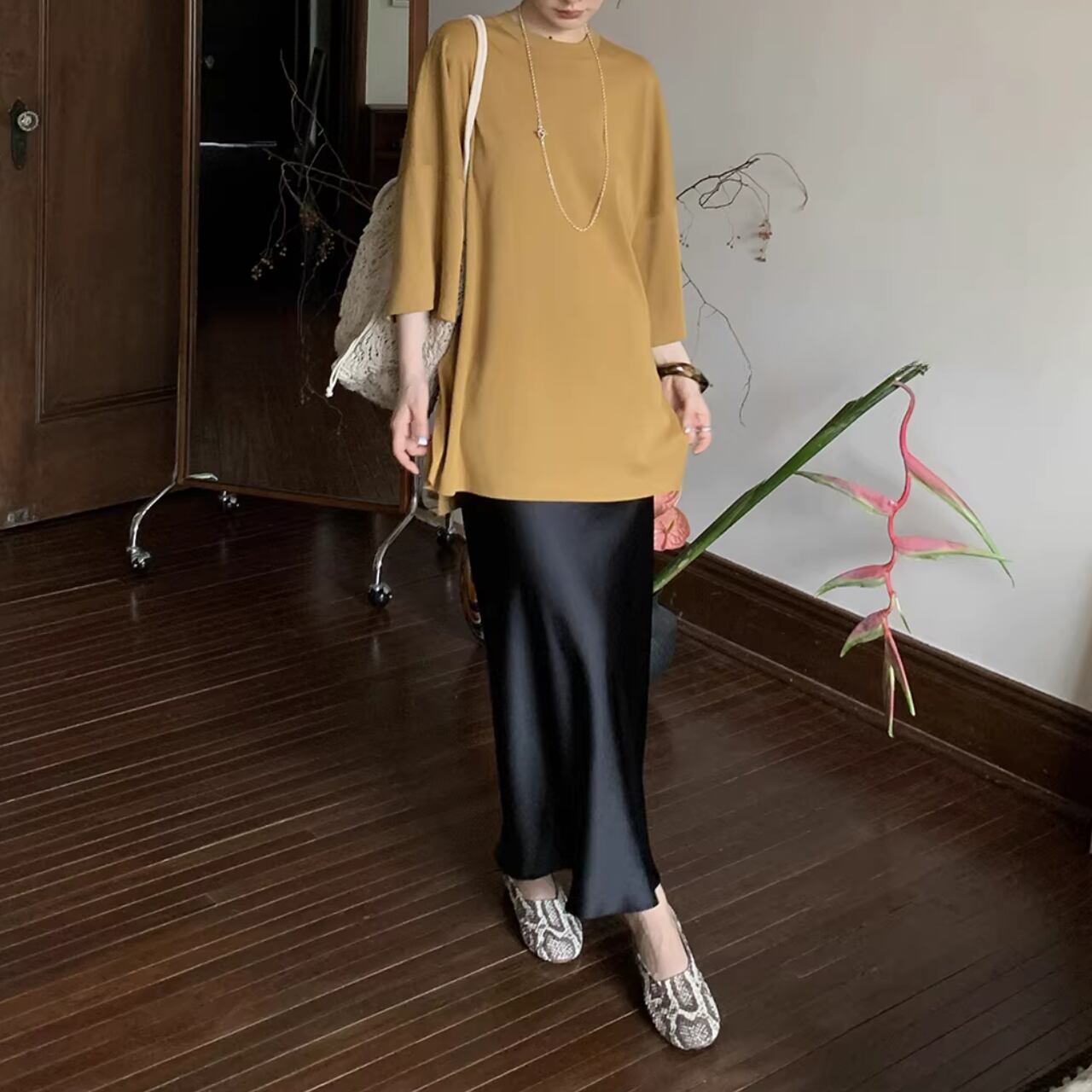 ヒップが隠れる丈感とサイドのスリットが、気になる体型をカバーしつつ、動きやすさをプラス。
