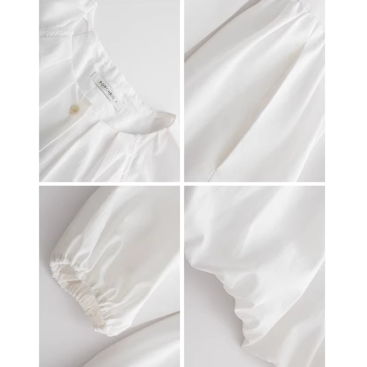 ミニ丈のAラインワンピースは、ギャザーが施されたデザインで、かわいらしさを演出します。