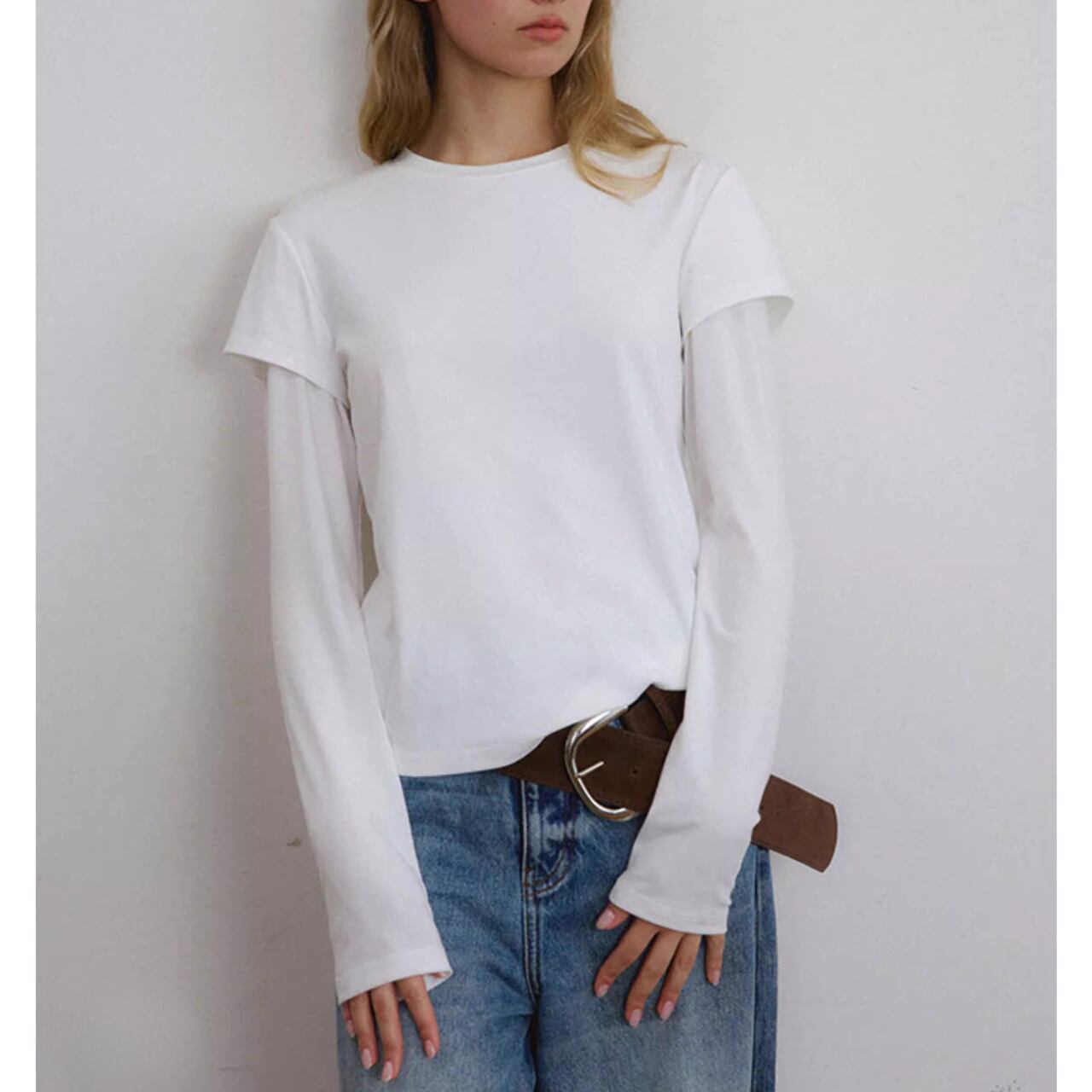 【レイヤード袖クルーネックツーピースTシャツ 】B00109