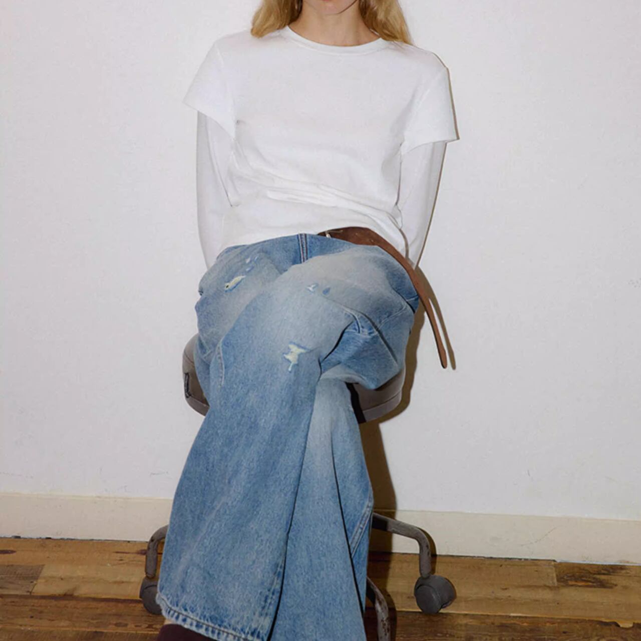シンプルなクルーネックのフェイクツーピースTシャツ。