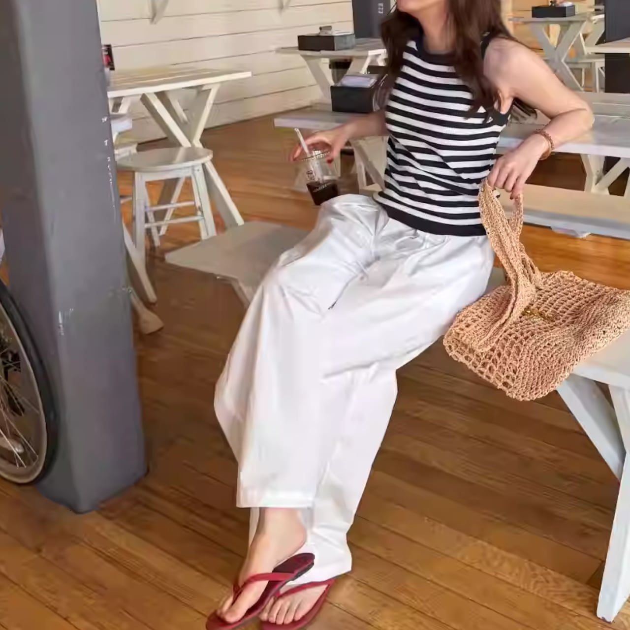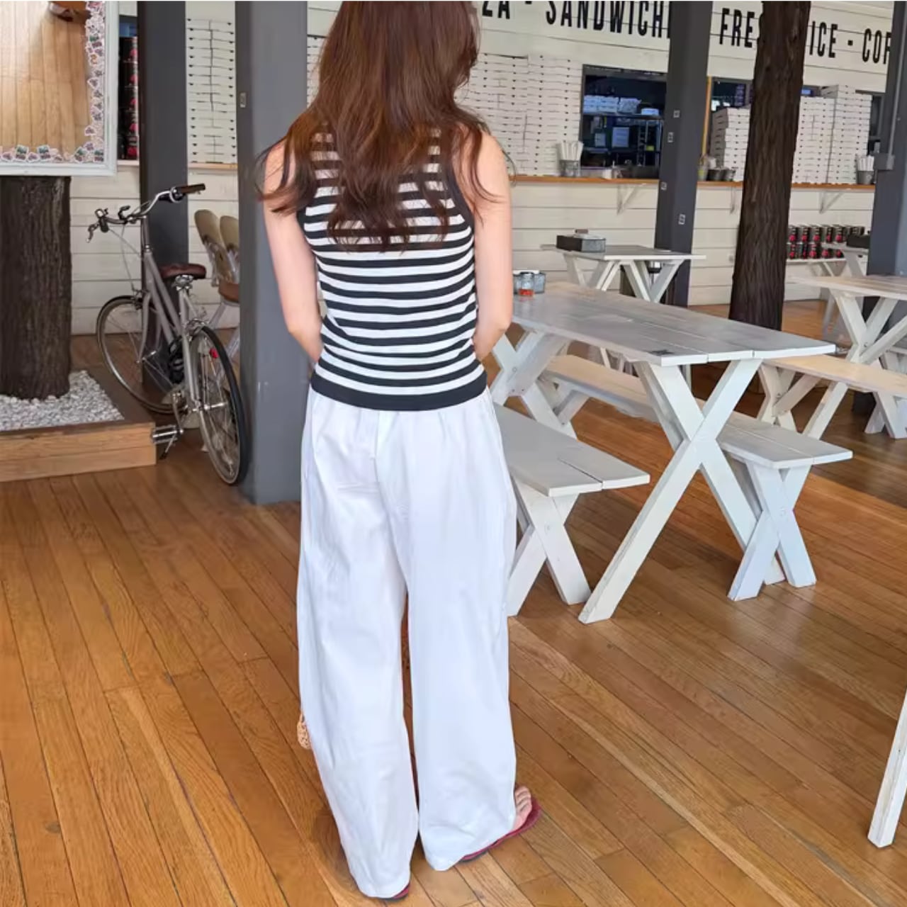 カジュアルな中にも上品さを感じさせる、ボーダー柄ノースリーブトップス。