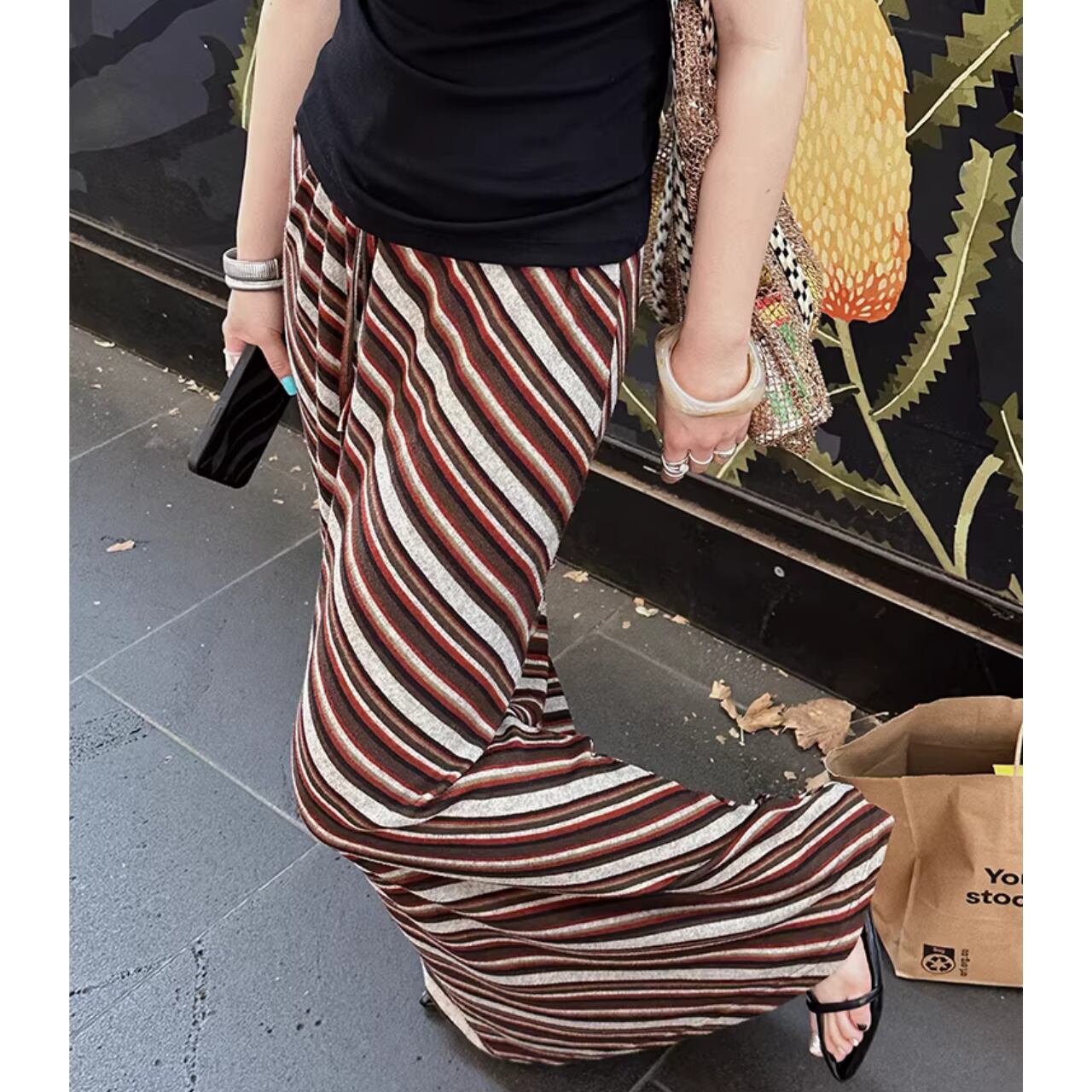 ストライプ柄が印象的なマキシ丈フレアロングスカートです。