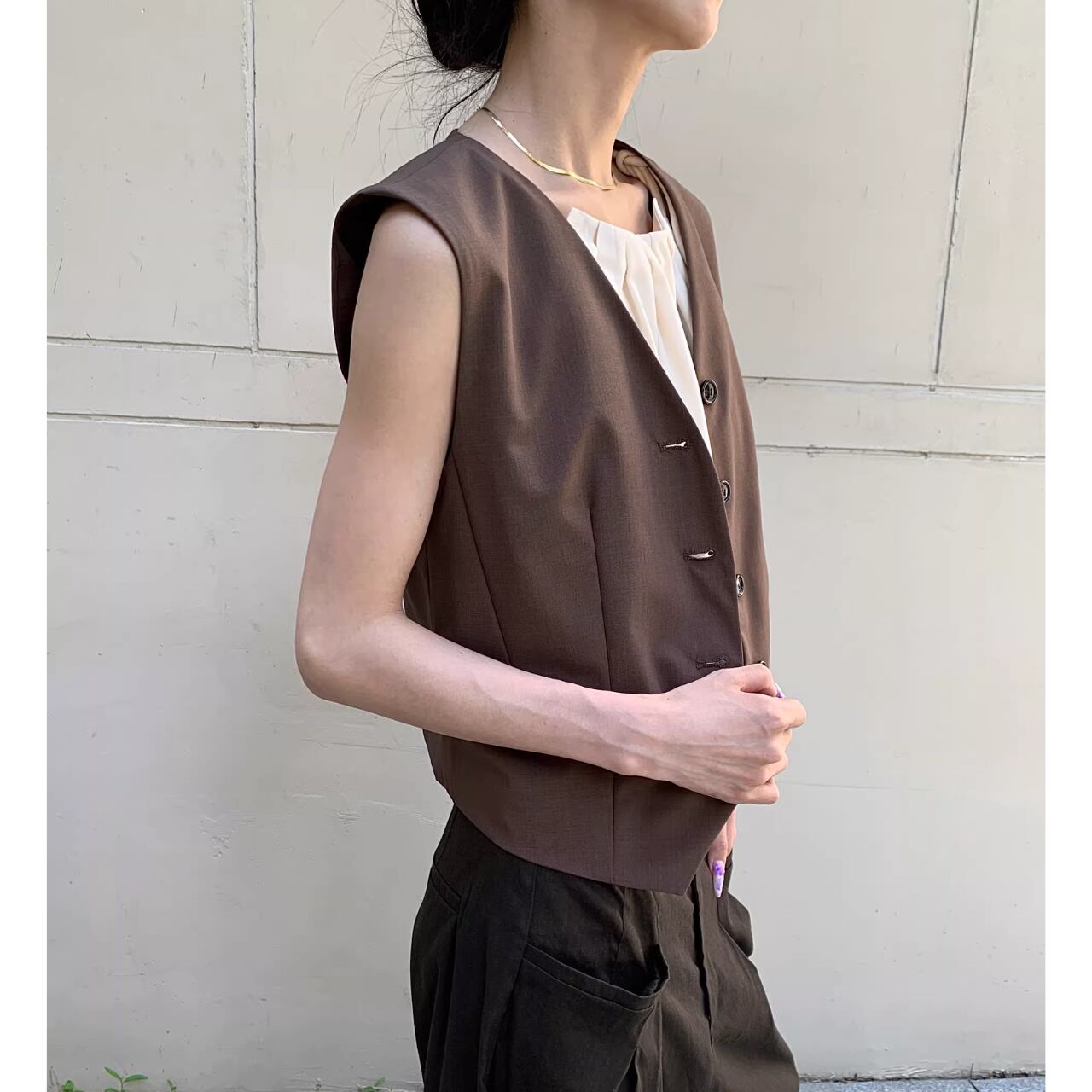 クールな着こなしを叶える、クロップド丈のノースリーブベスト。
