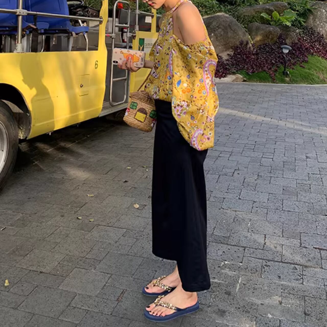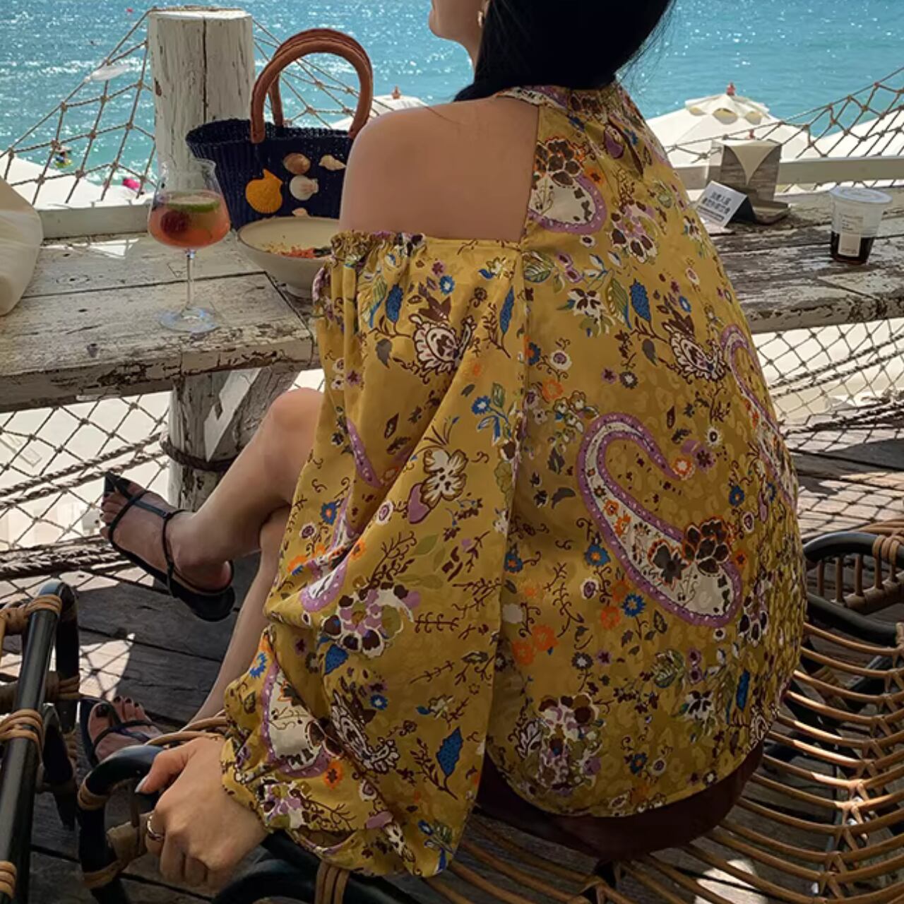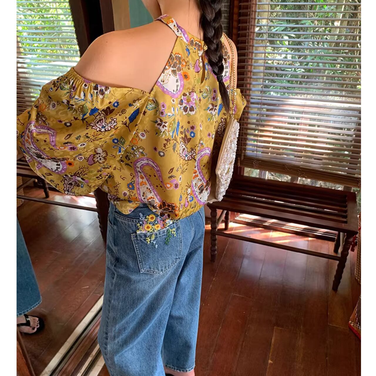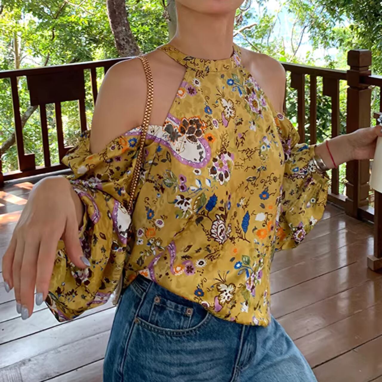 【オープンショルダー長袖花柄ブラウス 】B00133