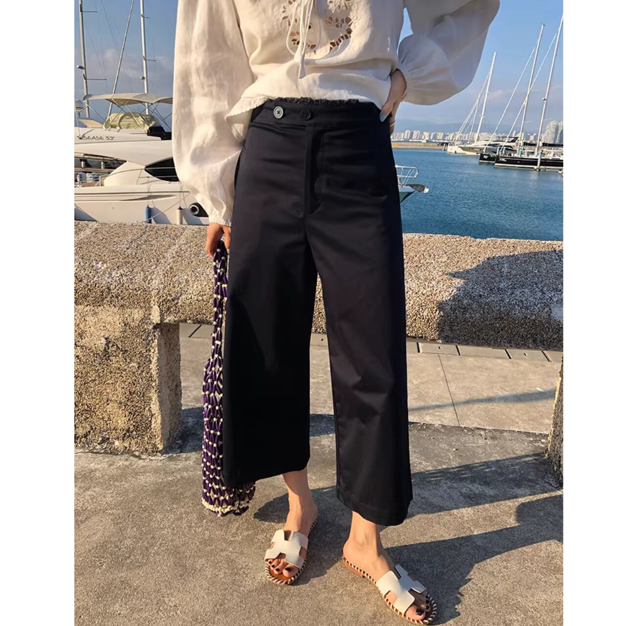 ハイウエストデザインが脚長効果を発揮するクロップドパンツ。