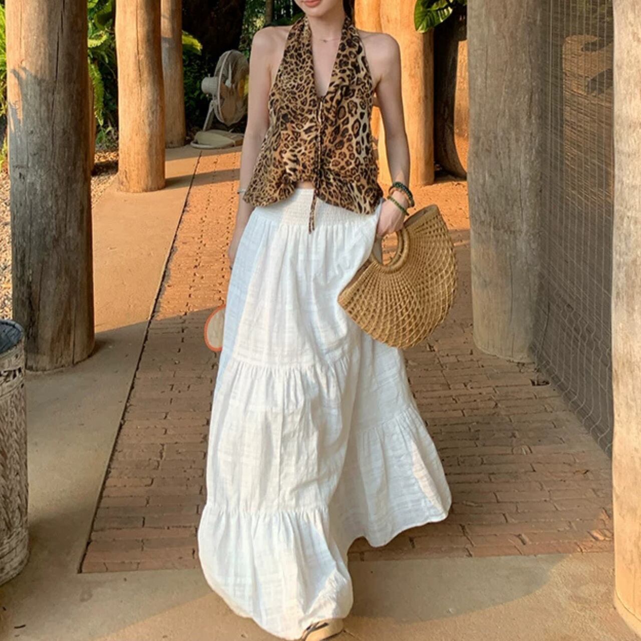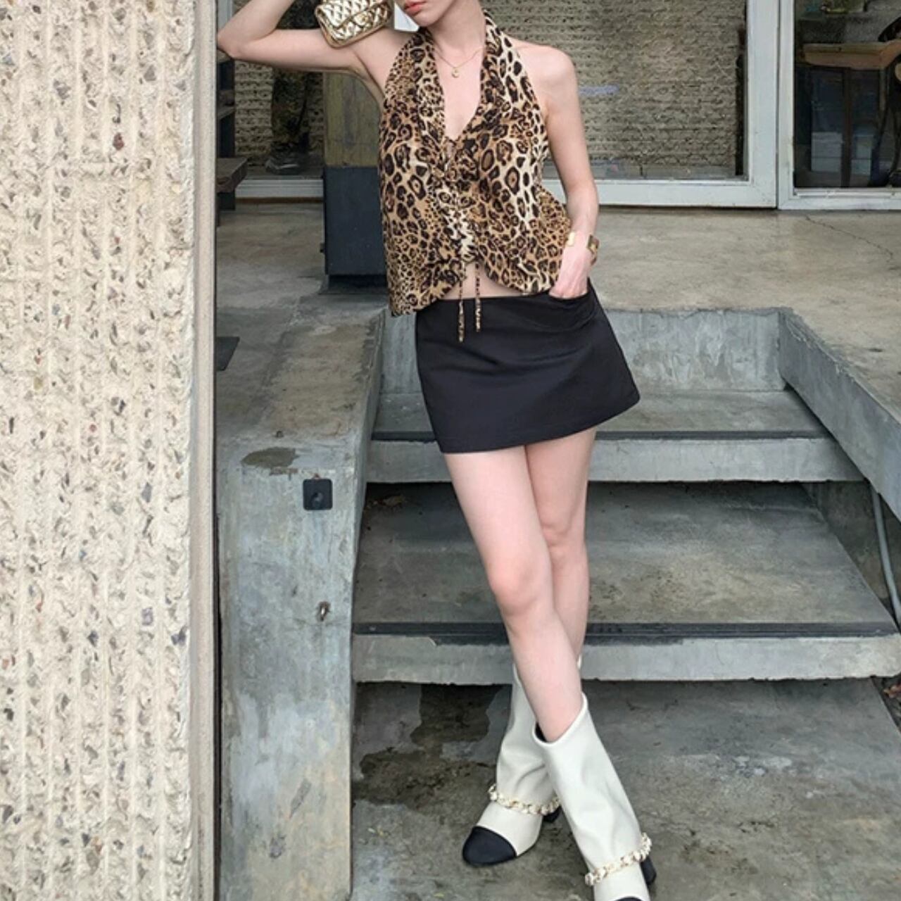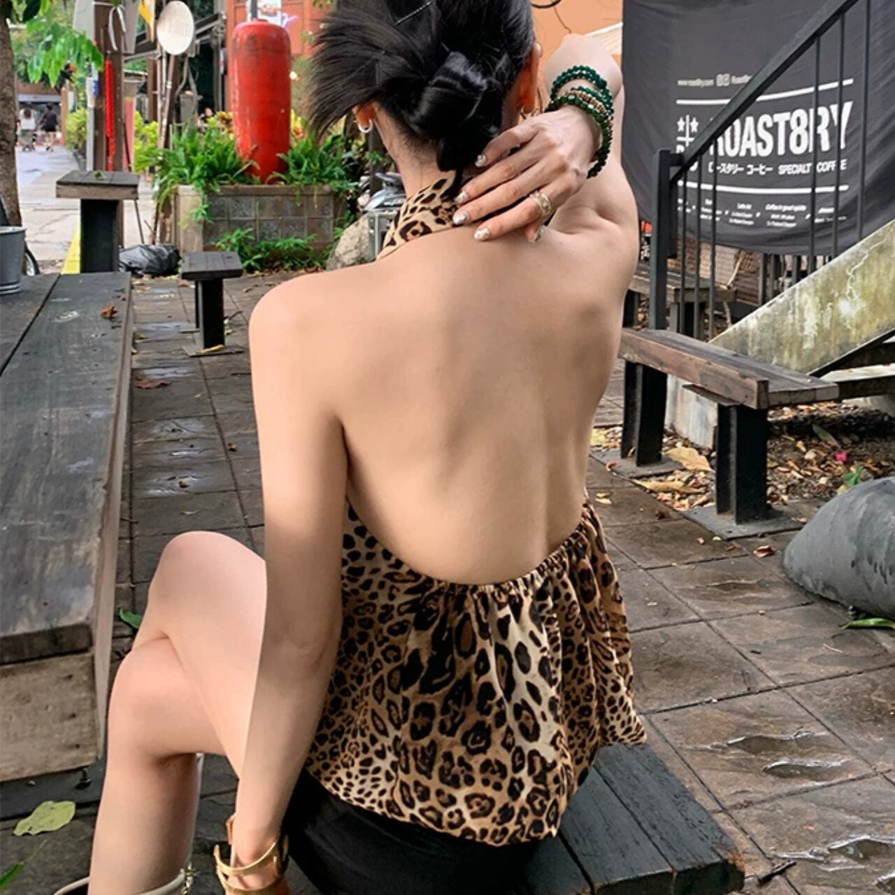 首元と肩のラインを美しく見せるホルターネックデザインのトップスです。